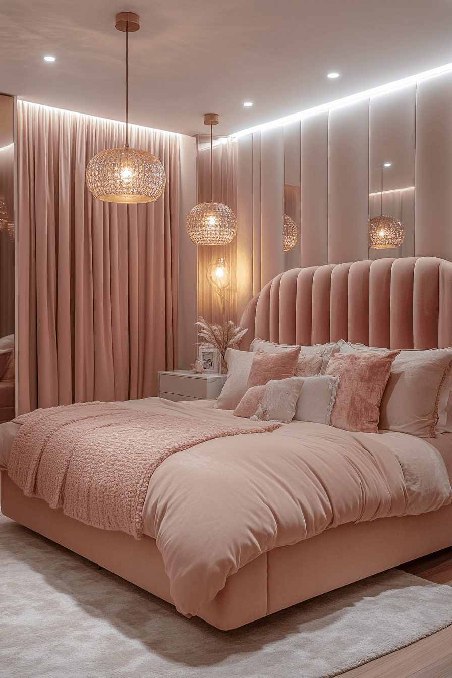 This glamorous Luxury Kids Bedroom features plush seating, striking prints, and designer lighting for a high-style atmosphere. Bold pinks or teals add vibrancy, while layered curtains and metallic mirrors increase opulence.