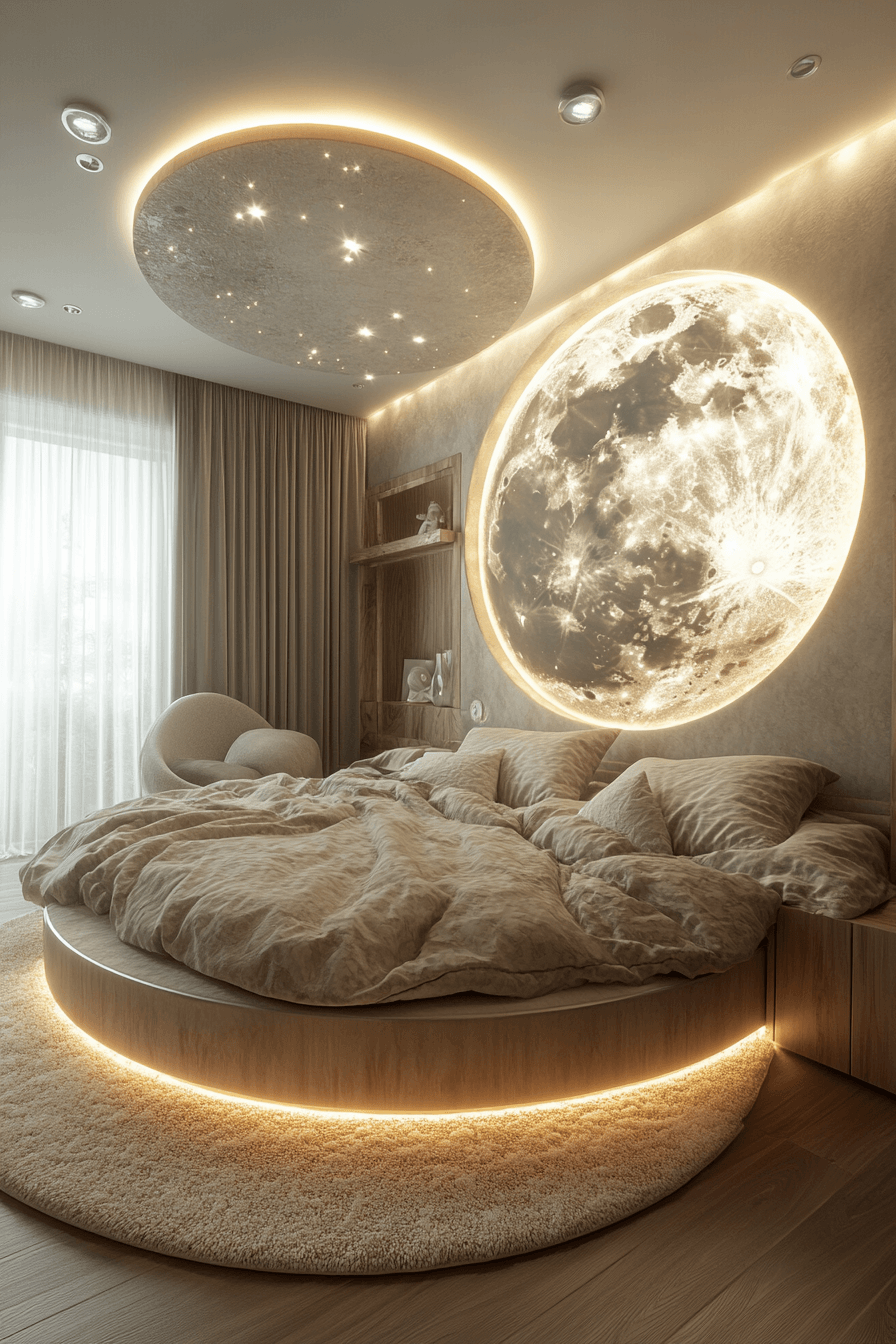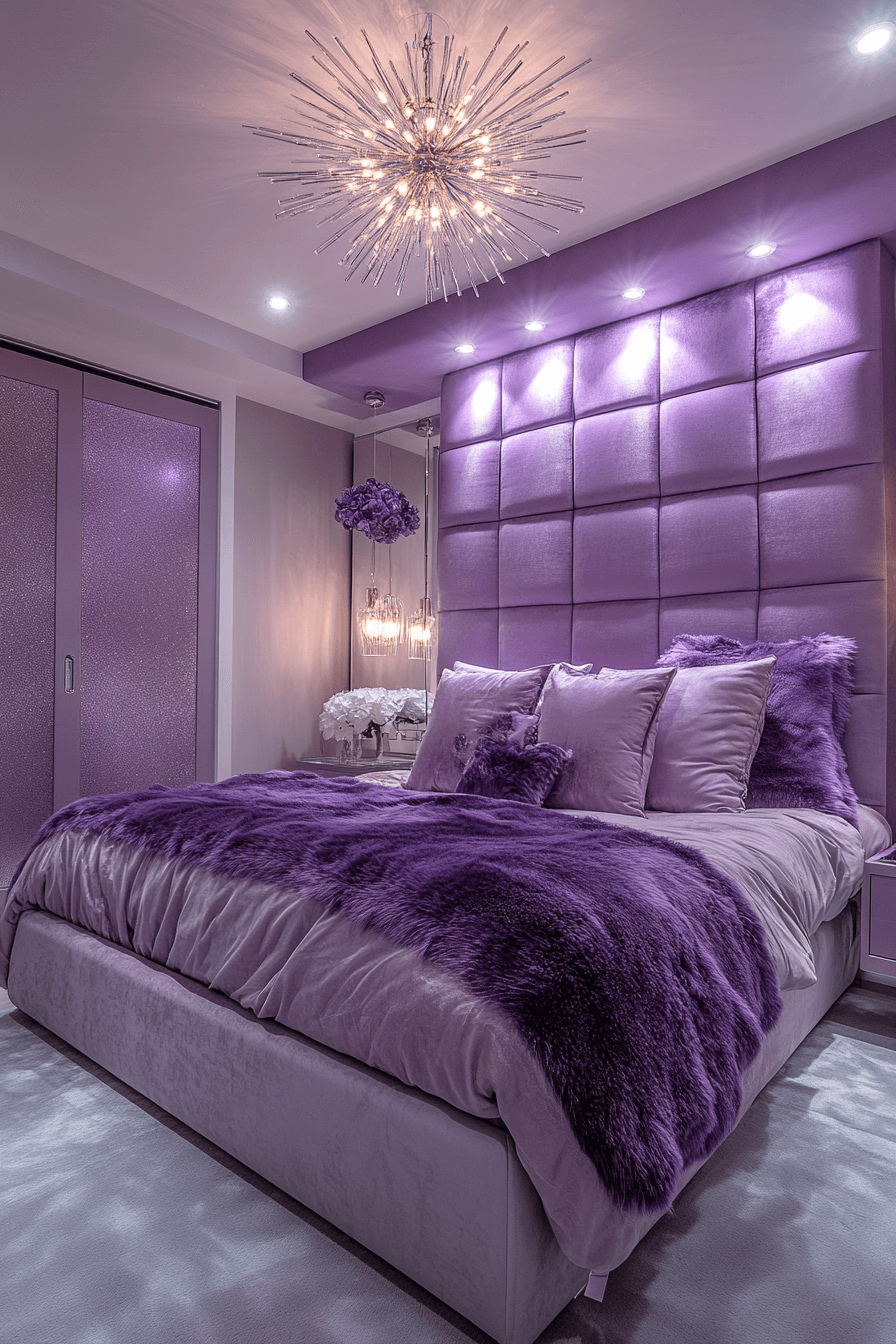 A twilight-inspired Luxury Kids Bedroom balances rich purples, silvery décor, and layered lighting for an enchanting vibe. Velvet drapery and celestial accents deepen the mood.