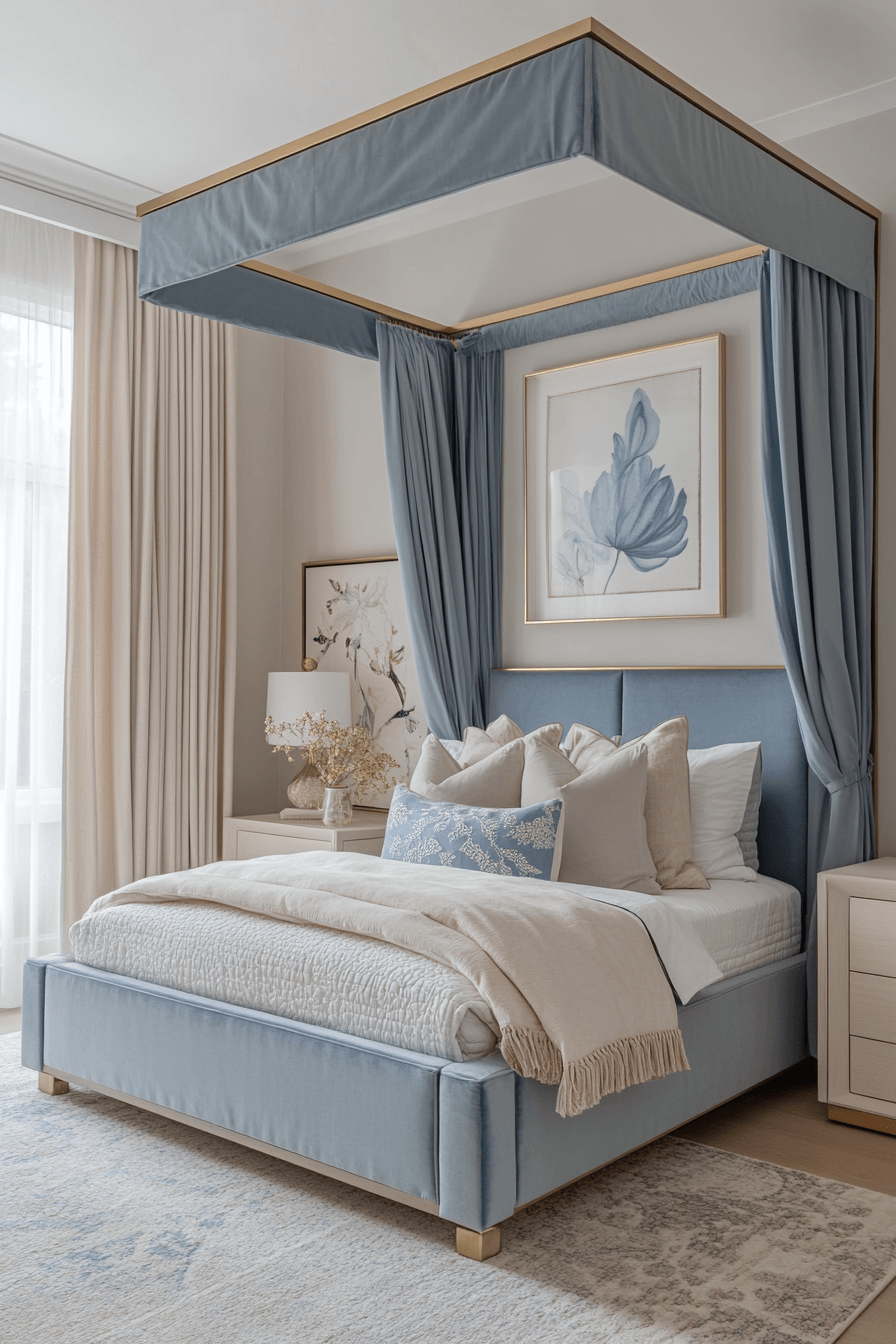 This castle-chic Luxury Kids Bedroom fuses canopy beds, crown molding, and rich drapery with a minimal palette for youthful elegance. Jewel-tone accents stand out against neutral backdrops, while textured rugs bring comfort.