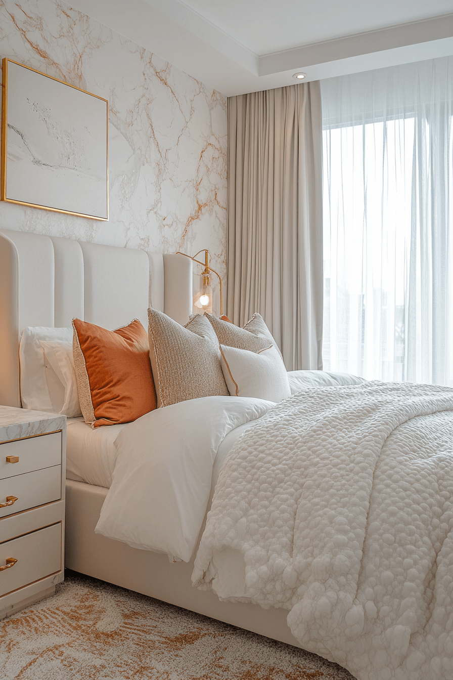 A marble-inspired Luxury Kids Bedroom pairs soft blush and white tones with metallic edging for a sophisticated touch. Faux-marble wallpaper enhances the upscale vibe, while rounded furniture and custom storage keep it kid-friendly.