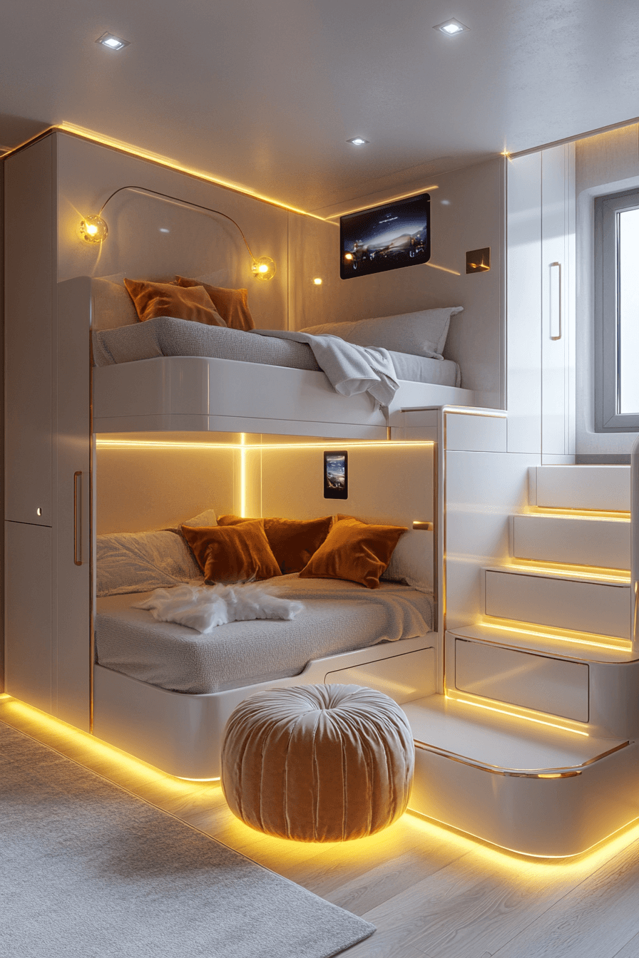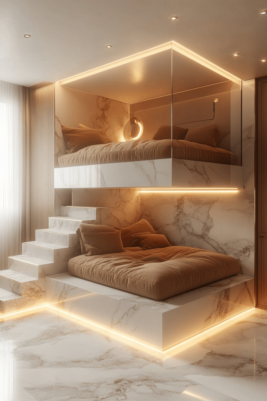 This loft-style Luxury Kids Bedroom features glossy finishes, floating shelving, and tiered beds to maximize space. Soft lighting keeps it bright, while built-in lounges create intimate zones.