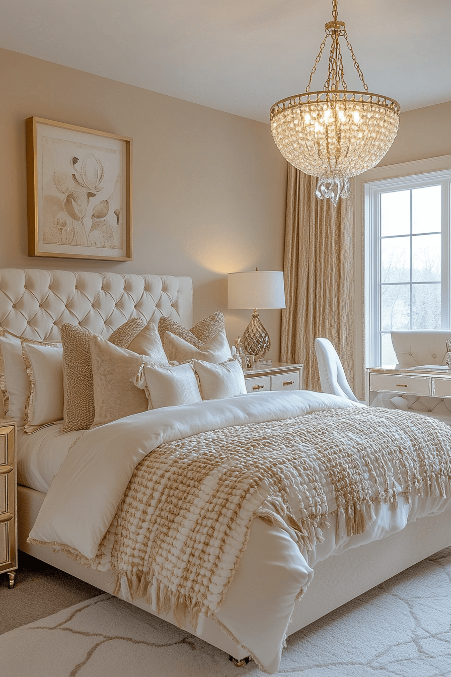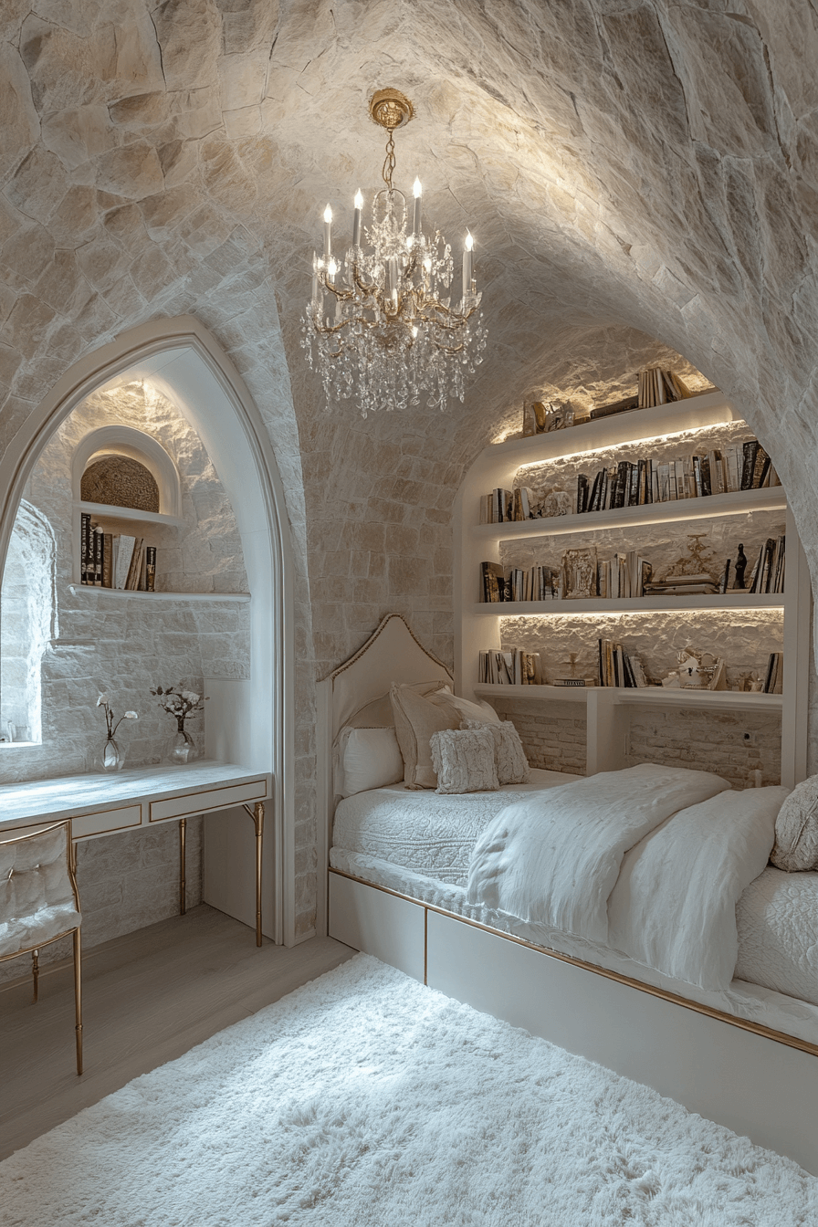 A golden elegance Luxury Kids Bedroom glows with soft creams, velvet textures, and shimmering gold accents. Chandeliers and intricate molding create grandeur, while functional layouts keep the room usable.