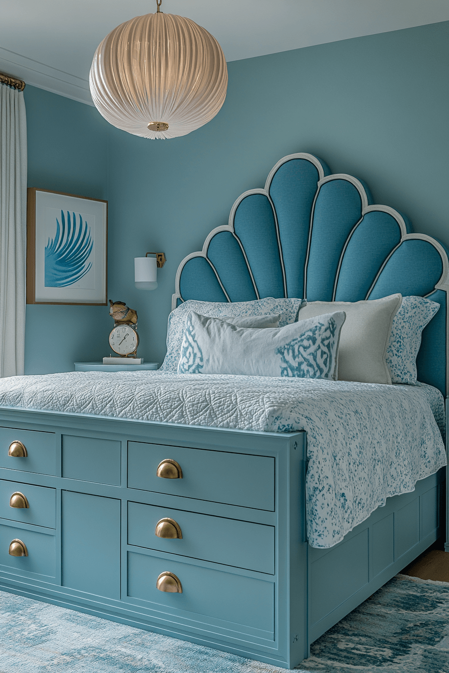 Ocean-inspired luxury fills this Luxury Kids Bedroom with seafoam greens, pale blues, and pearlescent finishes. Seashell details and wave patterns add playful charm, while modern furniture keeps it sleek.