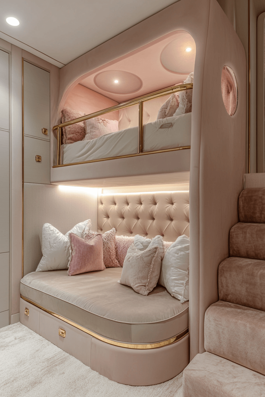 A couture-inspired Luxury Kids Bedroom showcases stacked bunks, velvet drapery, and brushed gold accents for an upscale sleepover space. Individual lighting enhances comfort and privacy.