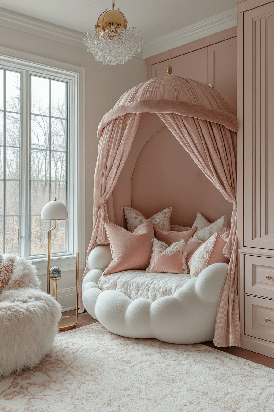 A cloud-soft Luxury Kids Bedroom surrounds children in comfort with draped canopies, oversized cushions, and crystal lighting. Thick rugs and layered fabrics add to its airy elegance.