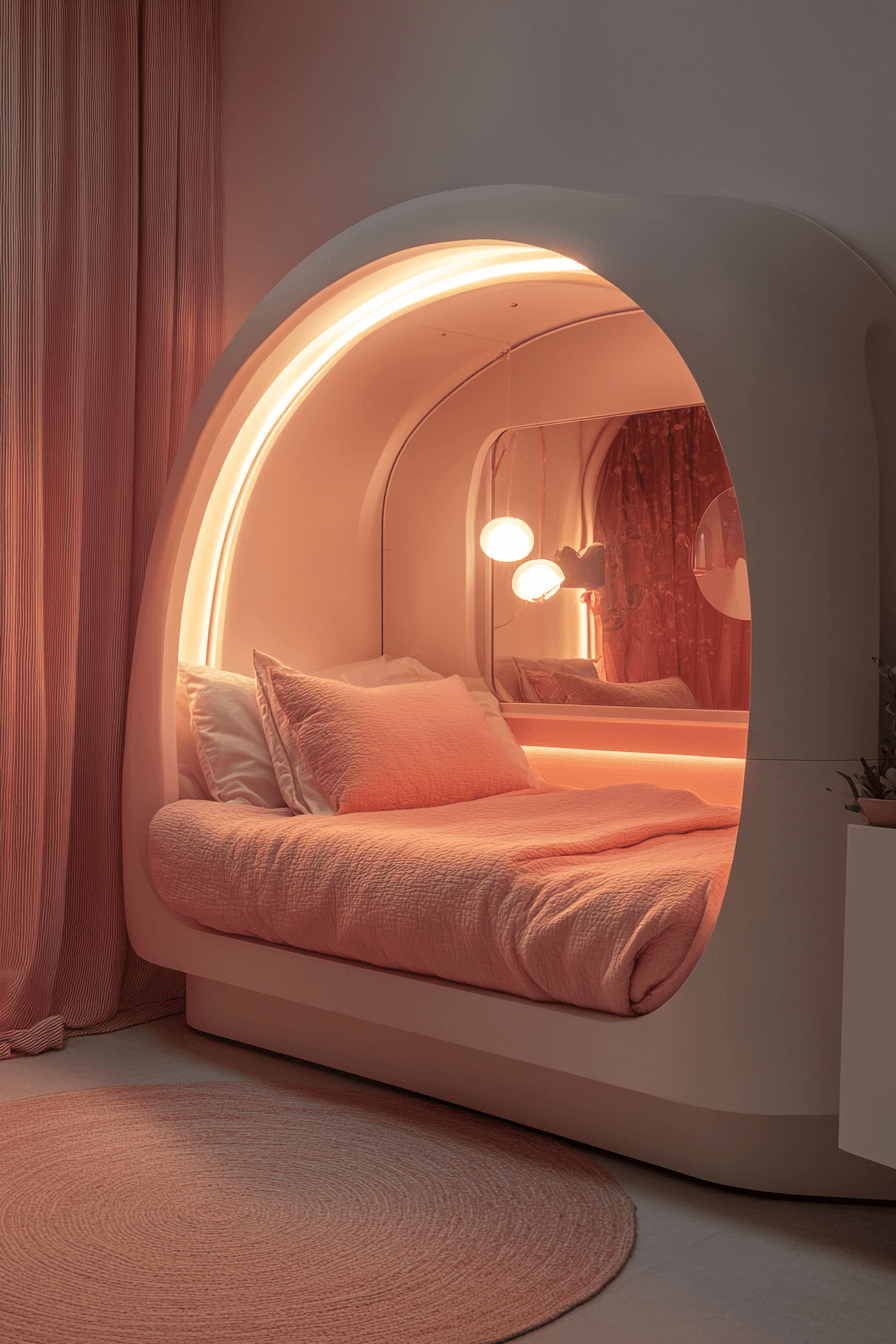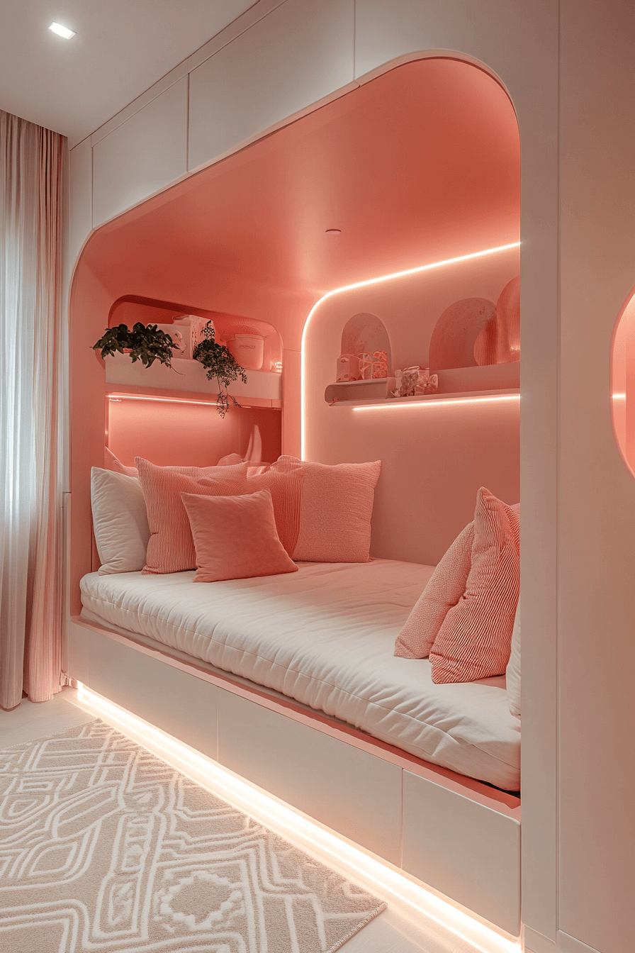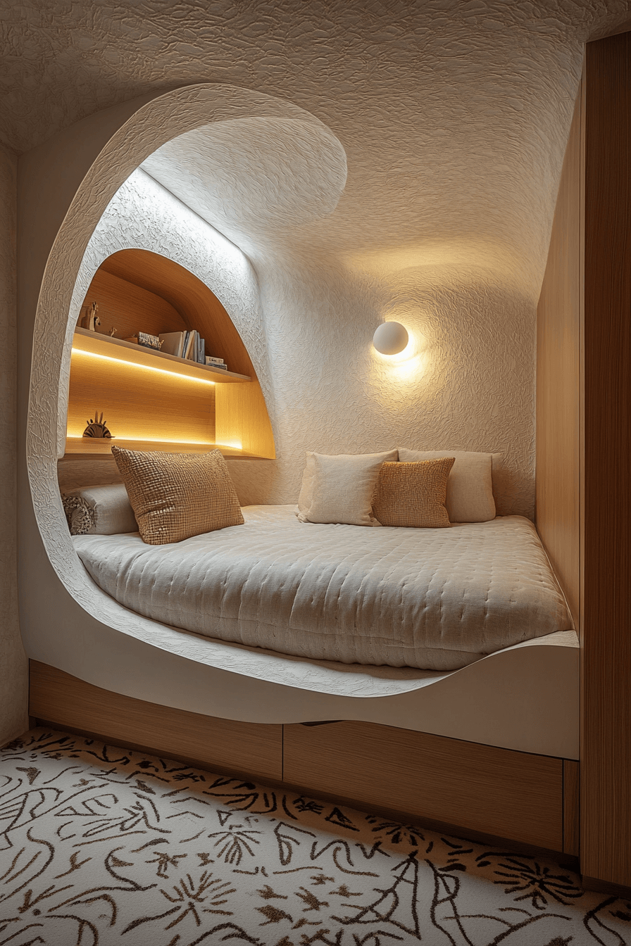 This cozy Luxury Kids Bedroom uses enclosed pods, custom wallpaper, and warm lighting for a private escape. Concealed compartments keep it organized.
