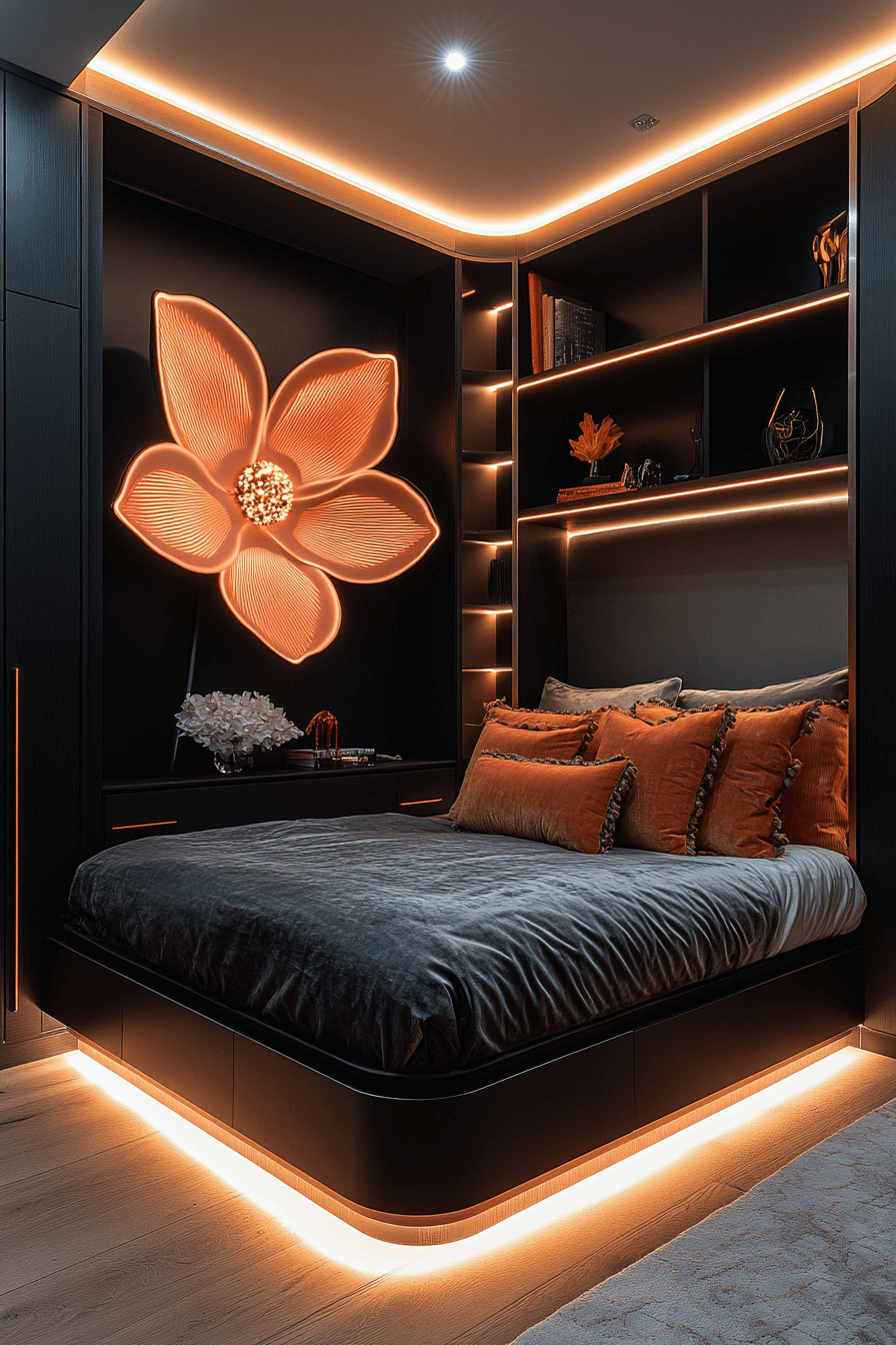 This neon-inspired Luxury Kids Bedroom energizes the space with bold lighting, reflective furniture, and bright color pops. Mirrored wardrobes visually enlarge the area.