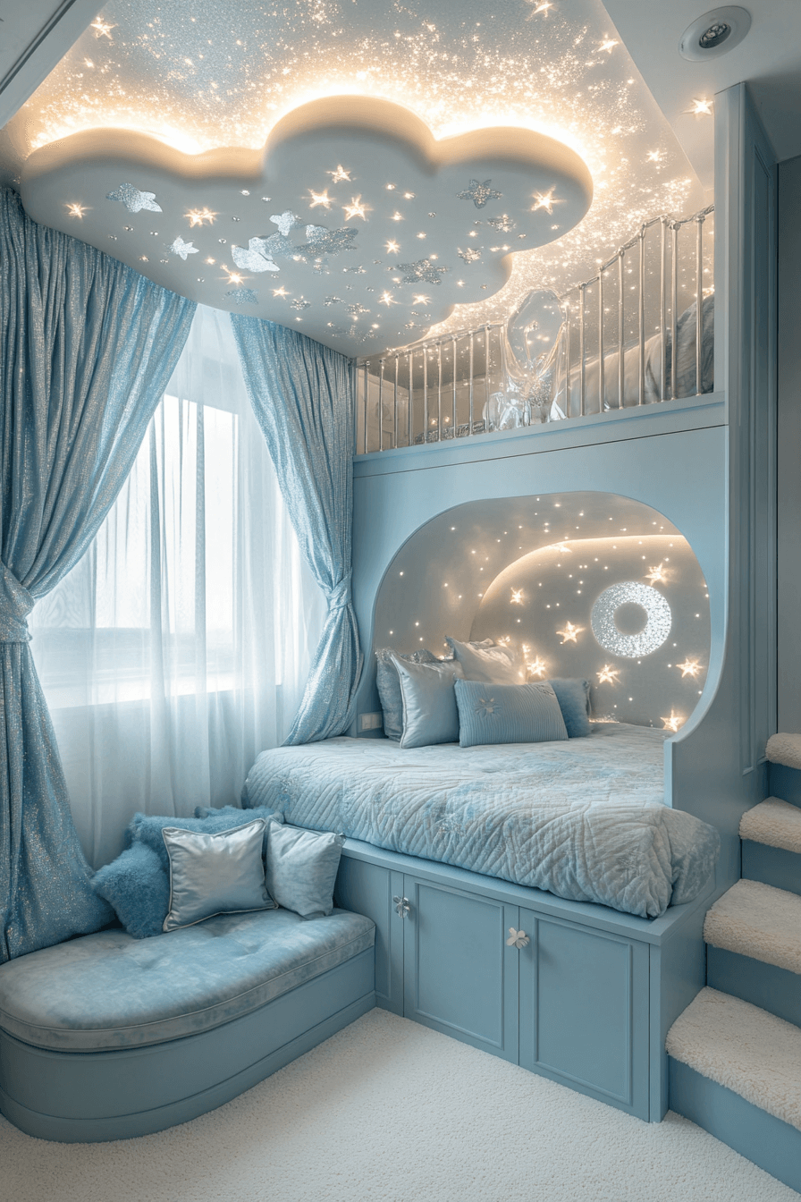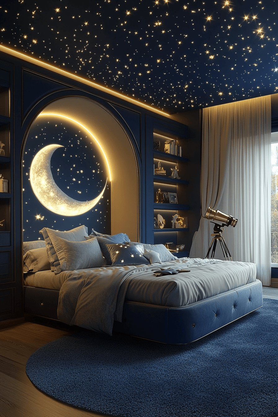 A starry escape Luxury Kids Bedroom surrounds children in celestial wonder with moon-shaped lamps, starry ceilings, and shimmering silver accents. Deep navy walls and velvet cushions provide warmth, while layered rugs and ambient lighting make bedtime magical.
