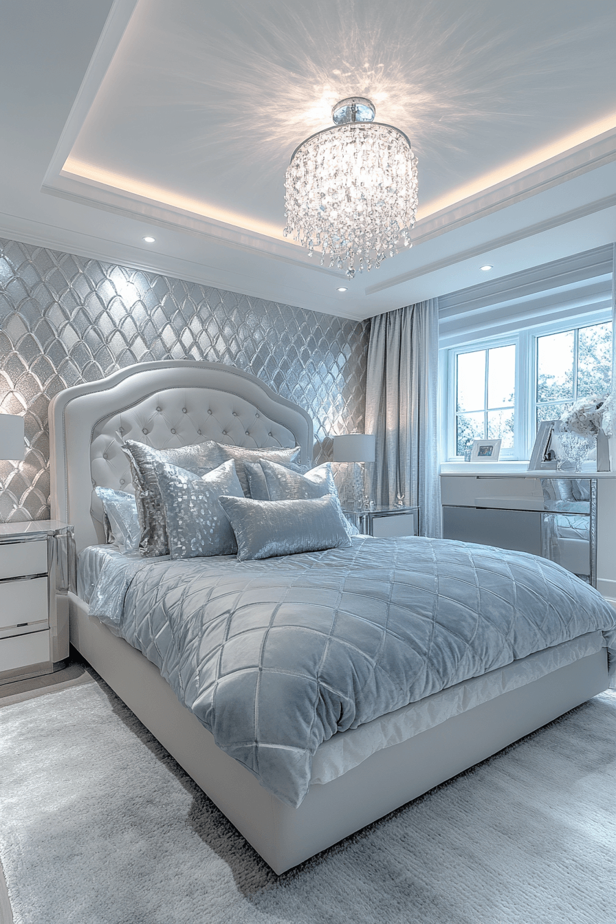 A diamond-inspired Luxury Kids Bedroom sparkles with geometric décor, crystal light fixtures, and glistening surfaces. Soft white and silver tones keep the space airy, while hidden drawers ensure a polished, clutter-free look.