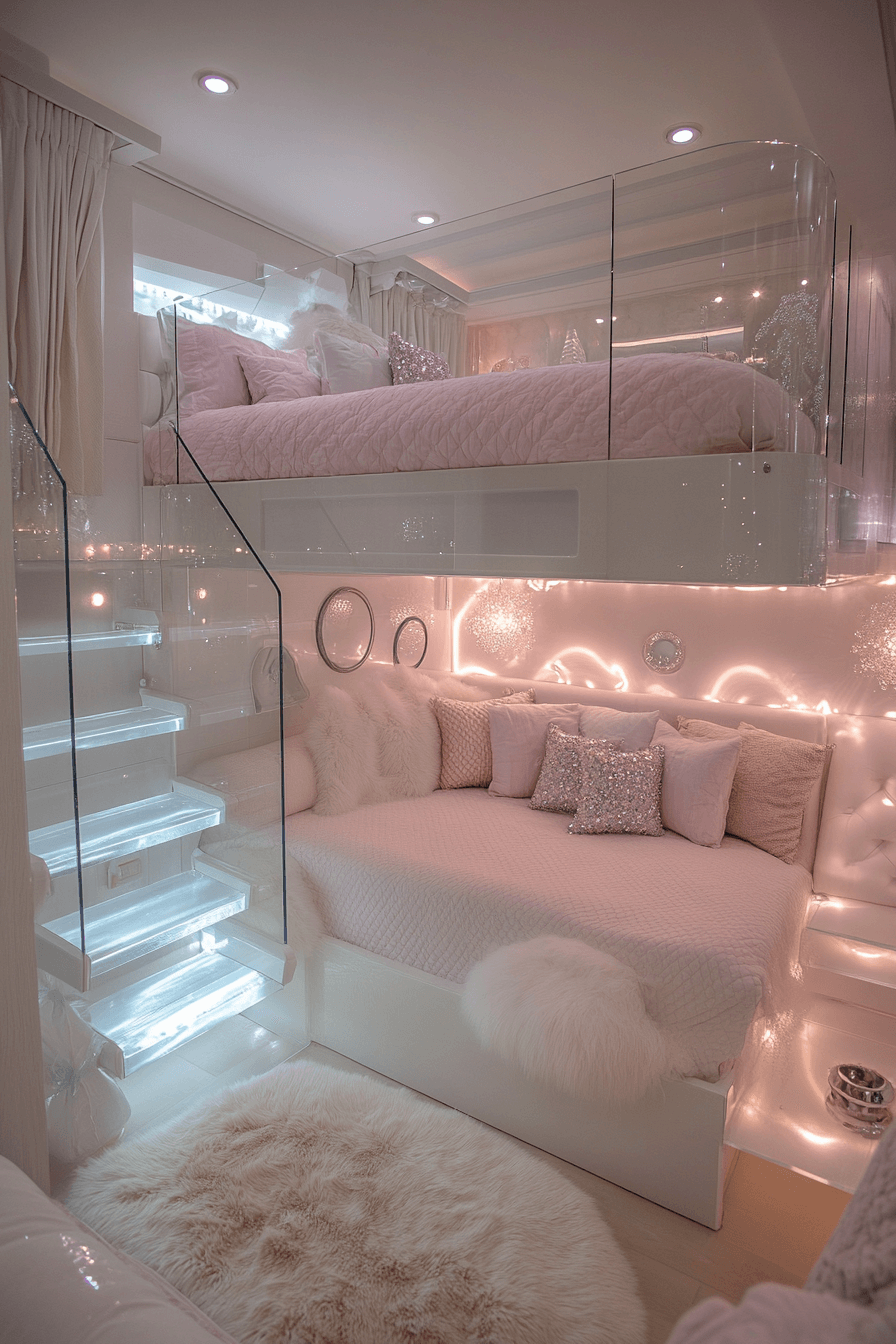 This sleek Luxury Kids Bedroom shines with acrylic furniture, glowing crystal lights, and reflective accents that brighten the room. Pale walls open the space visually, while a loft bed adds height and utility. Plush rugs and faux fur soften the contemporary feel.