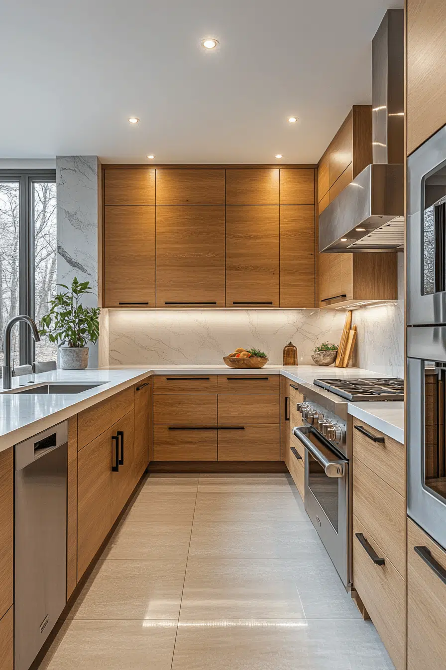 Strong minimalist maple kitchen cabinets strip away excess for visual clarity. Flat surfaces highlight maple’s organic tone. The design feels confident and modern. These cabinets pair well with hidden hardware. The space feels calm and bold. Simplify powerfully with minimalist maple kitchen cabinets now!