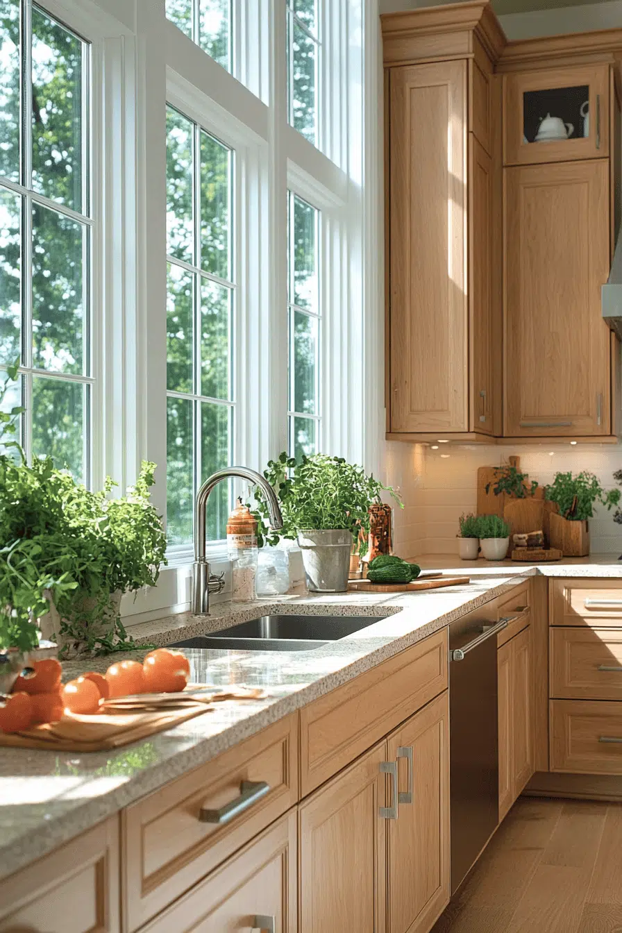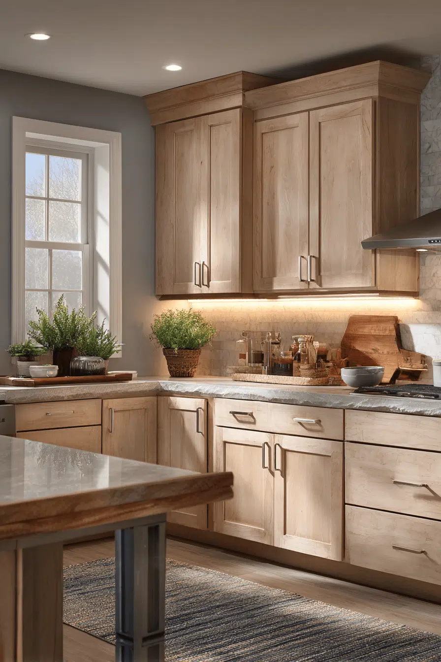 Sunlit maple kitchen cabinets brighten interiors with a fresh, optimistic feel. Their warm light tone reflects daylight beautifully. The look feels inviting and energizing without being overpowering. Maple’s versatility makes it easy to style with modern or classic elements. These cabinets uplift daily routines. Refresh your kitchen with sunlit maple cabinetry today!