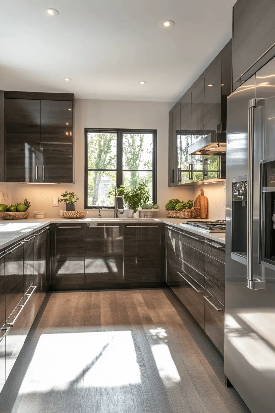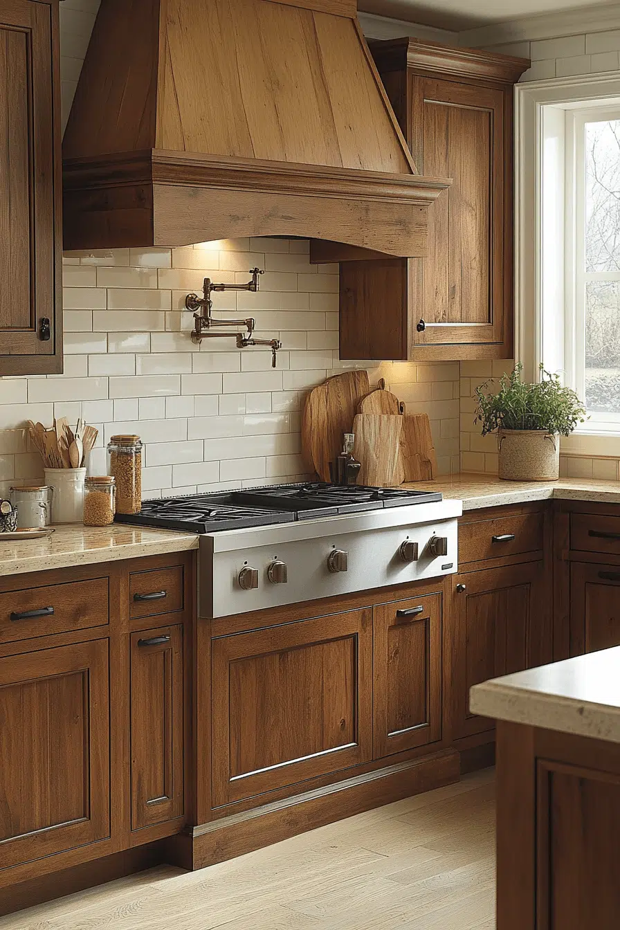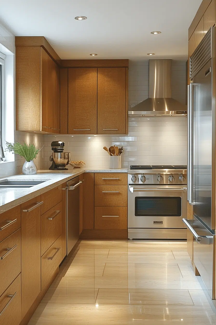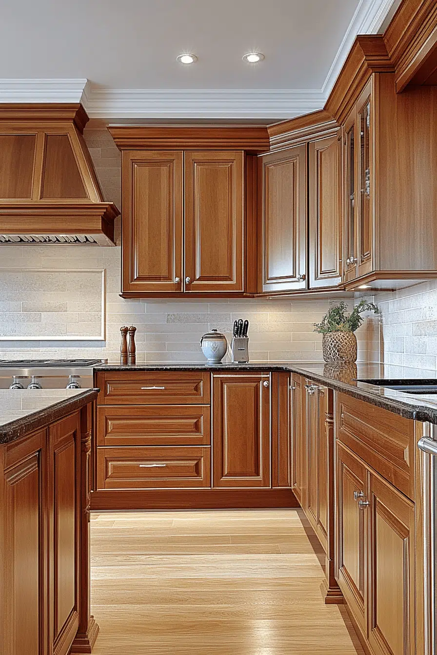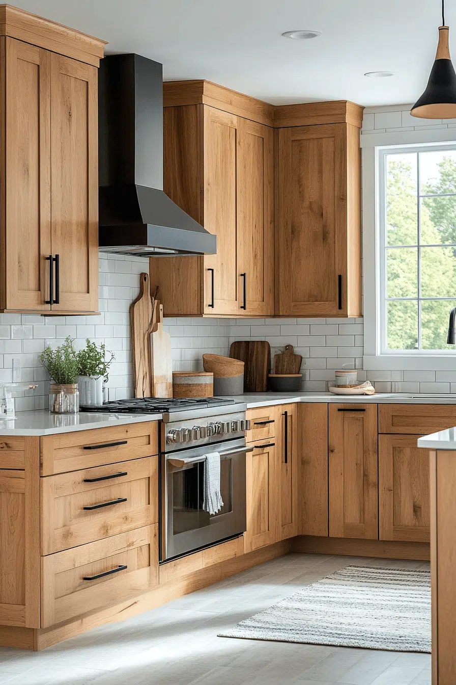 Bright maple kitchen cabinets with a soft golden cast make kitchens feel cheerful and expansive. Their light-reflective surface enhances openness while maintaining a natural warmth. Maple’s smooth texture pairs beautifully with stone, quartz, or bold accent colors. This style works especially well in open-concept spaces. The result feels uplifting and energetic. Bring sunshine indoors with glowing maple kitchen cabinets today!