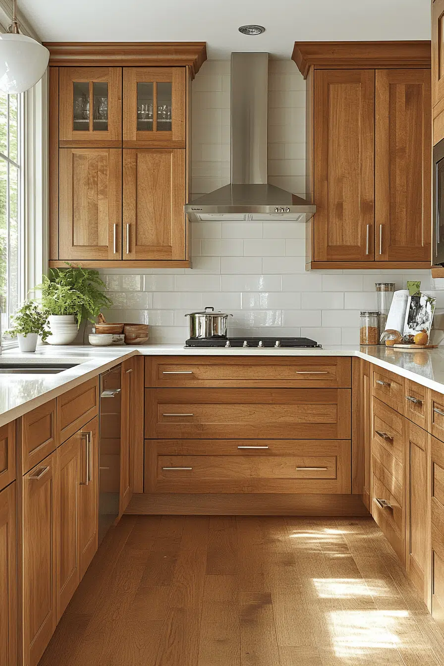 Bright maple kitchen cabinets with a soft golden cast make kitchens feel cheerful and expansive. Their light-reflective surface enhances openness while maintaining a natural warmth. Maple’s smooth texture pairs beautifully with stone, quartz, or bold accent colors. This style works especially well in open-concept spaces. The result feels uplifting and energetic. Bring sunshine indoors with glowing maple kitchen cabinets today!