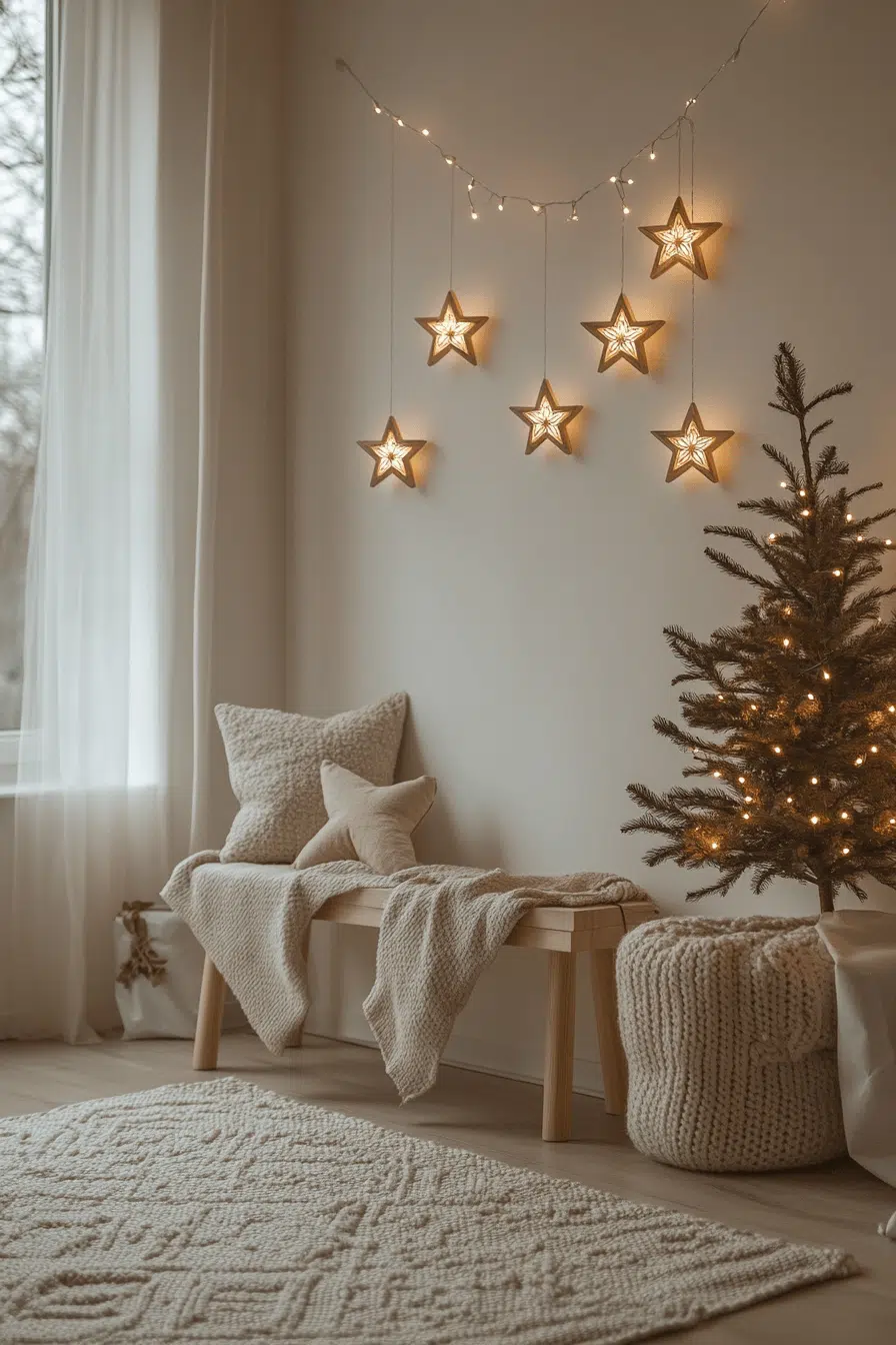 Soft star accents add a gentle glow to minimalist christmas decor without overwhelming the space. Wooden or metallic stars shimmer subtly against neutral backdrops, giving the room a touch of festive charm. These small additions create magic through softness rather than excess. The result is cozy, modern, and beautifully understated.