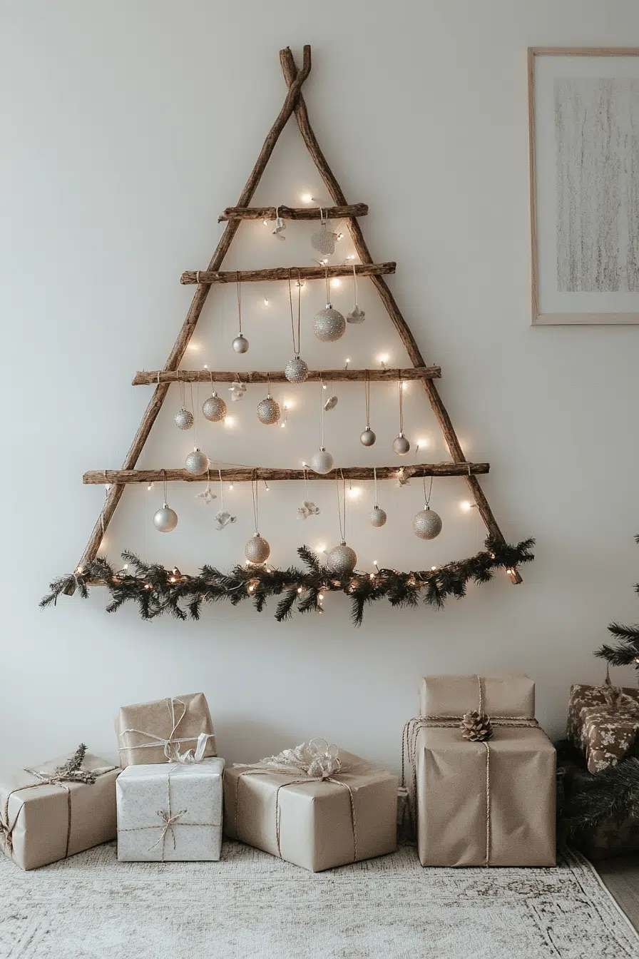 A wall-mounted tree brings creativity and function to minimalist christmas decor while saving floor space. Simple branches or a structured wooden outline mimic the shape of a full tree in a beautifully minimal way. A few ornaments or soft lights complete the look with ease. The result is modern, clever, and delightfully uncluttered.