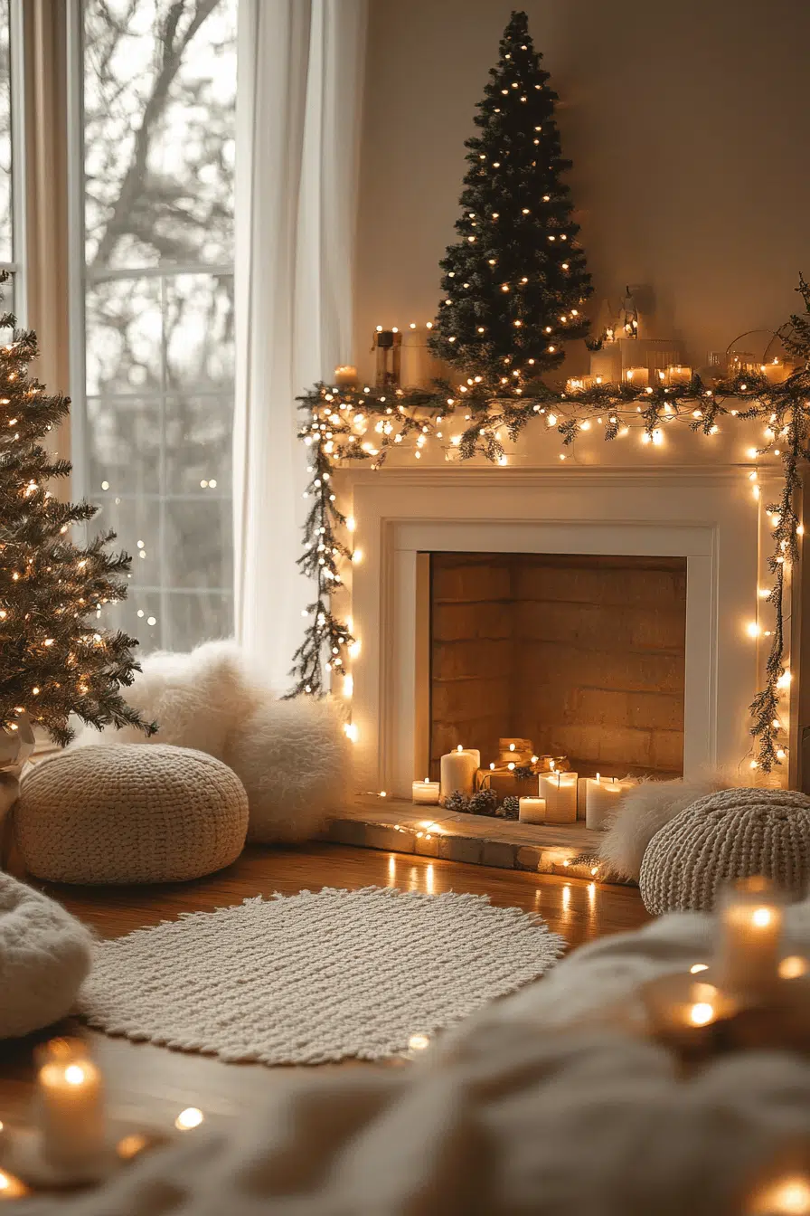 A calm mantel featuring muted tones and slender candles introduces a graceful expression of minimalist christmas decor. Linen stockings and subtle greenery complement the quiet atmosphere without adding clutter. This gentle arrangement supports the fireplace as the visual heart of the room. Each element contributes warmth and intention while keeping the scene serene.