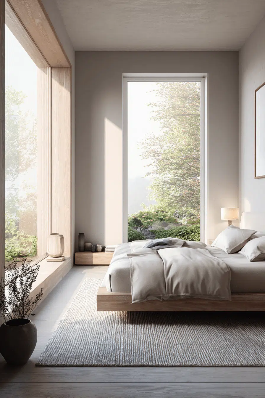 Nordic warmth shines through pale woods and clean lines. This minimalistic bedroom feels both cozy and open. Natural light enhances the serene atmosphere. The design feels fresh and timeless.