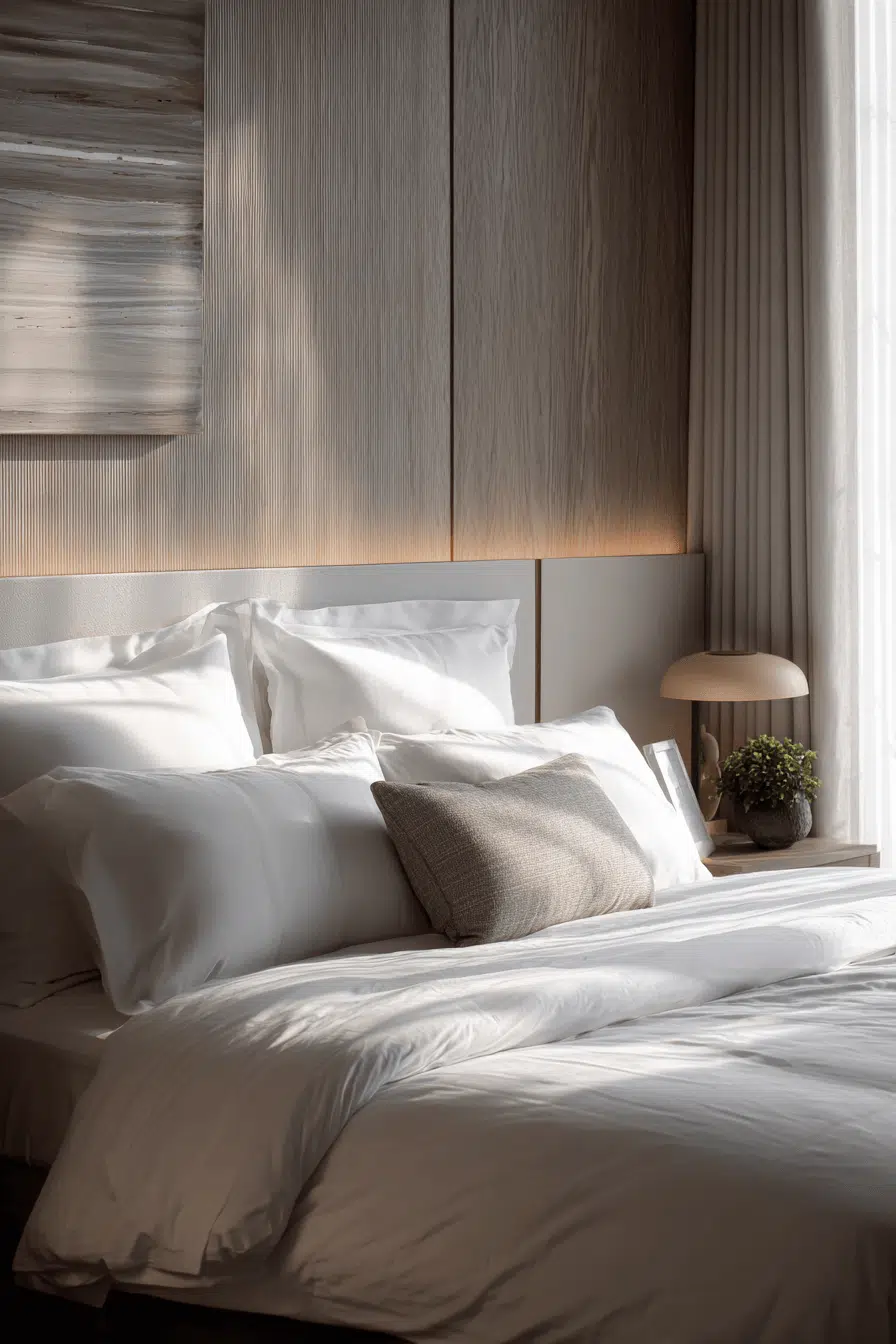 Refined materials elevate this understated minimalistic bedroom. Subtle luxury details add depth while maintaining simplicity. The palette stays soft and cohesive. It’s elegant without excess.