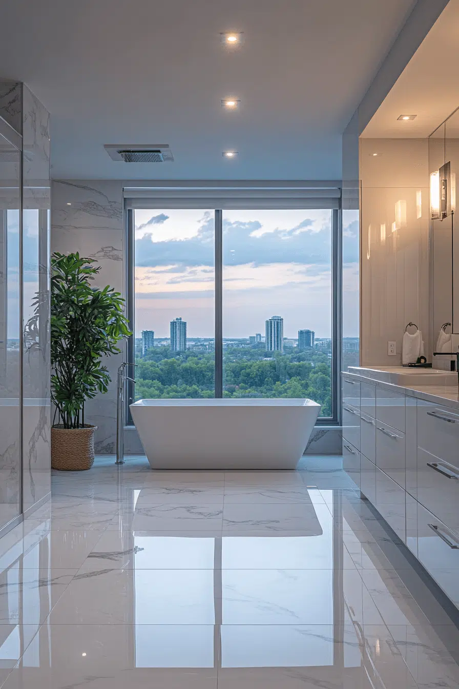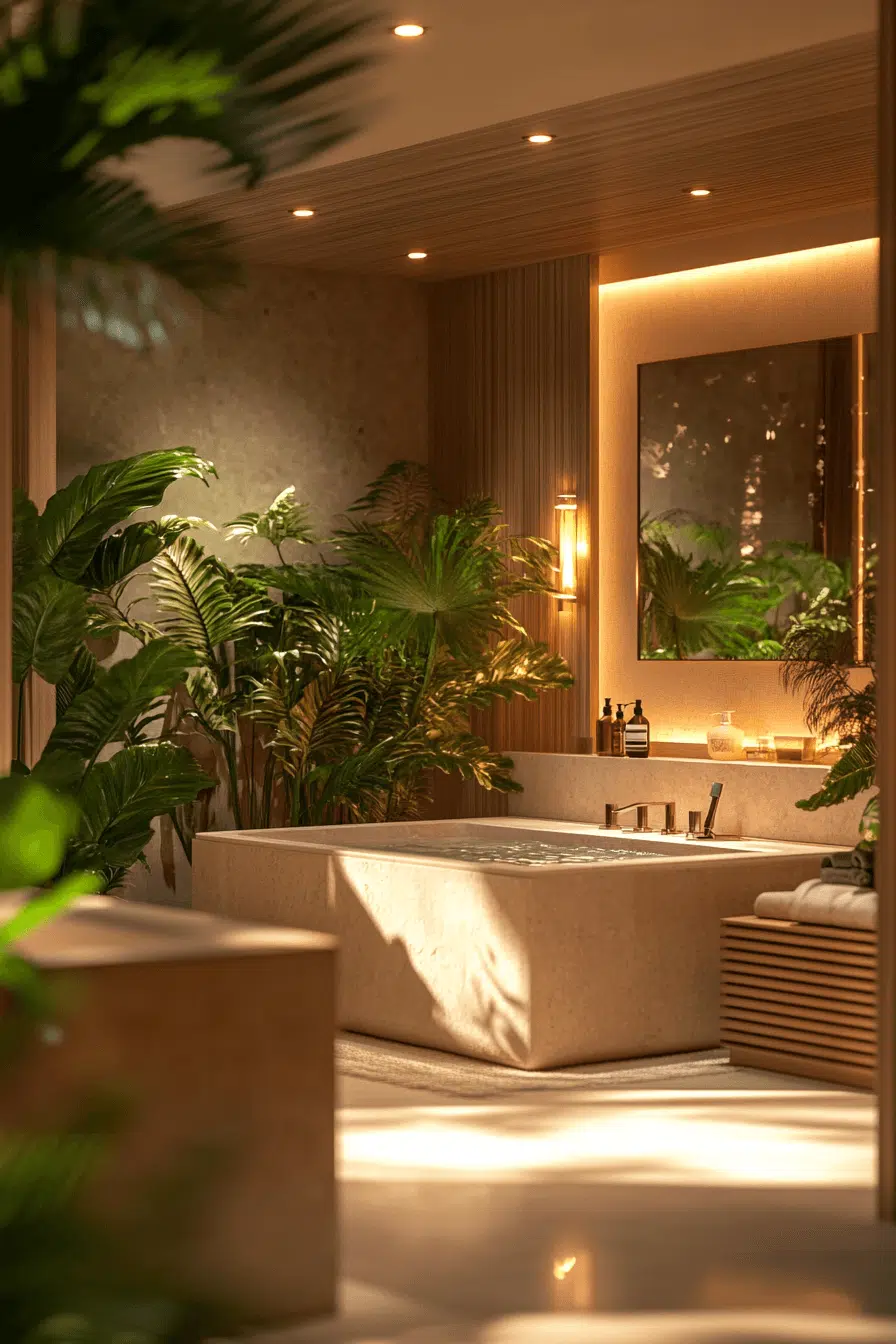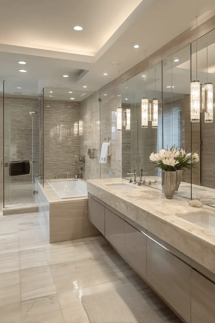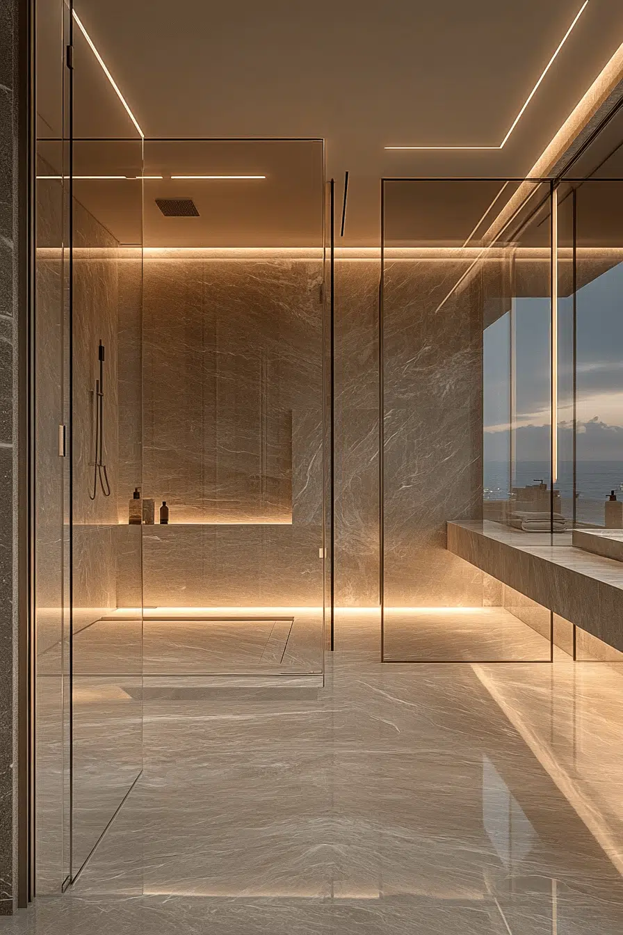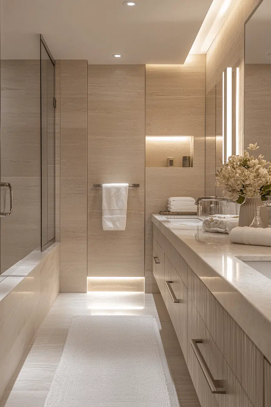 Layered lighting transforms this modern luxury bathroom into a glowing sanctuary. Recessed fixtures, sconces, and backlit mirrors eliminate harsh shadows. Warm neutrals amplify the inviting atmosphere. Streamlined fittings maintain a clean and contemporary aesthetic. The overall experience feels like a boutique hotel suite. Click to bring soft illumination into your modern luxury bathroom!