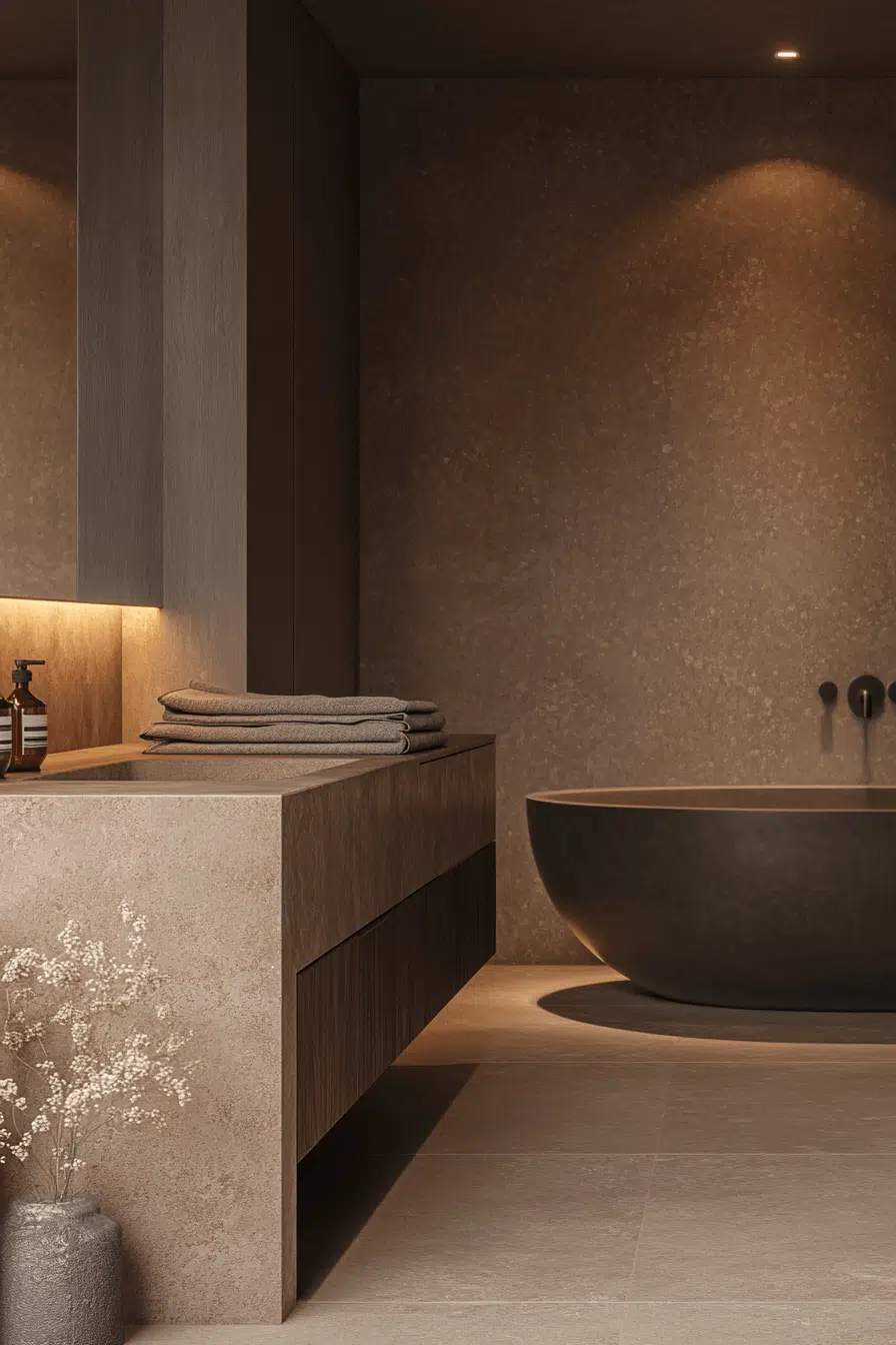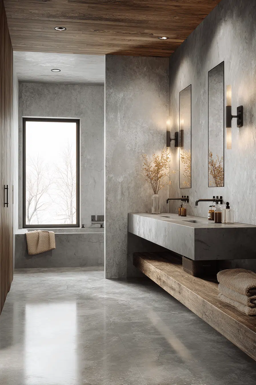 Microtopped concrete surfaces create sculptural continuity in this modern luxury bathroom. The sleek finish feels contemporary and architectural. Warm wood and soft lighting balance the cool tone. Minimal fixtures enhance clarity. The design feels edgy yet welcoming. Tap to explore concrete-inspired modern luxury bathroom styles!