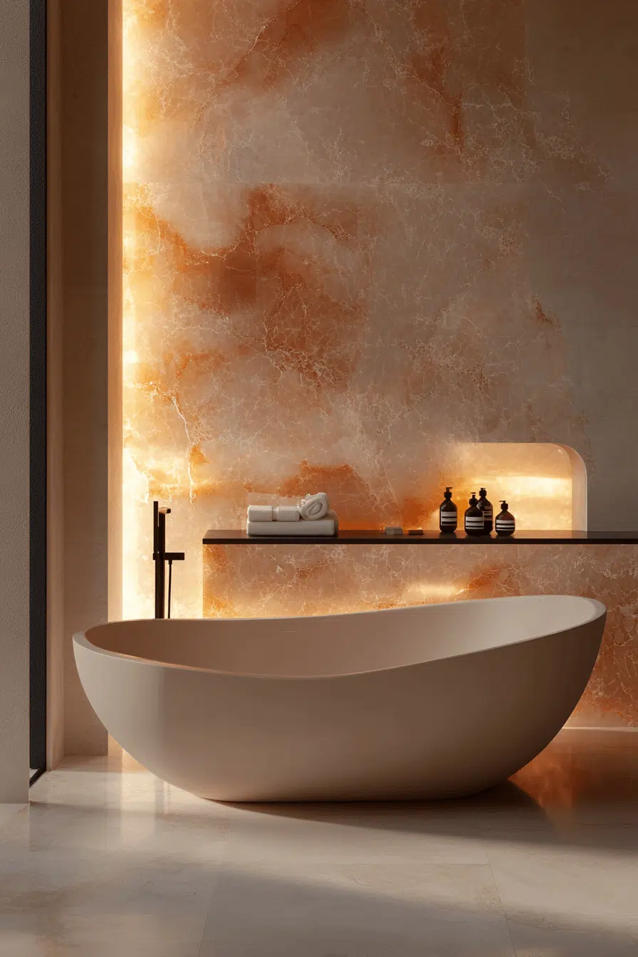 Onyx surfaces and gold accents create a striking focal point in this modern luxury bathroom. The natural patterns add dramatic character. Sleek metallic fixtures enhance glamour without excess. Balanced proportions keep the look refined. Bold materials meet modern restraint perfectly. Click to see how onyx can redefine your modern luxury bathroom!