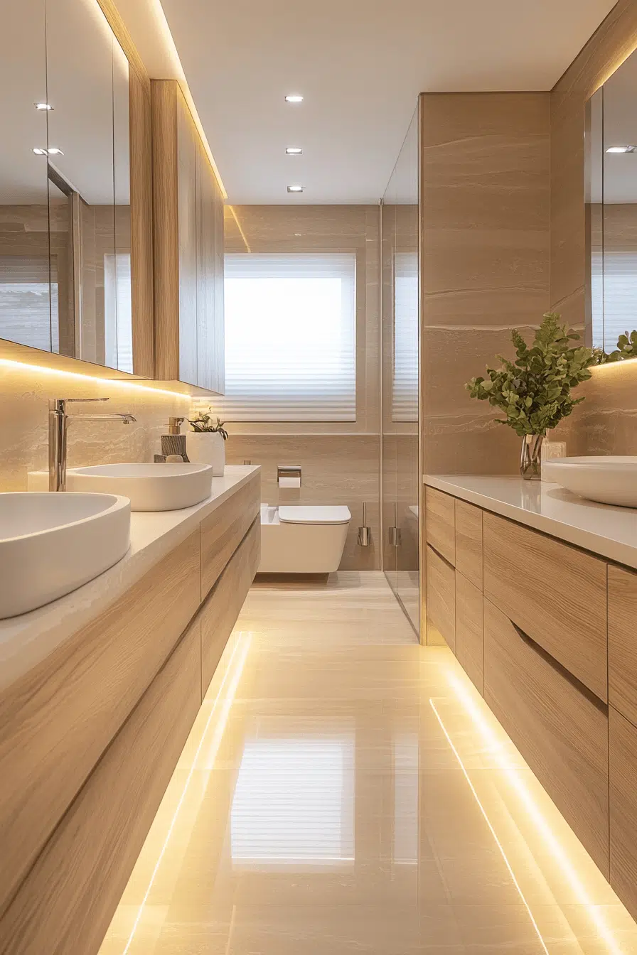 Oversized backlit mirrors anchor this modern luxury bathroom with a sleek glow. Integrated lighting enhances daily routines beautifully. Clean cabinetry keeps surfaces uncluttered. Reflective elements add depth. The effect feels contemporary and polished. Tap to explore illuminated mirror modern luxury bathroom inspiration!