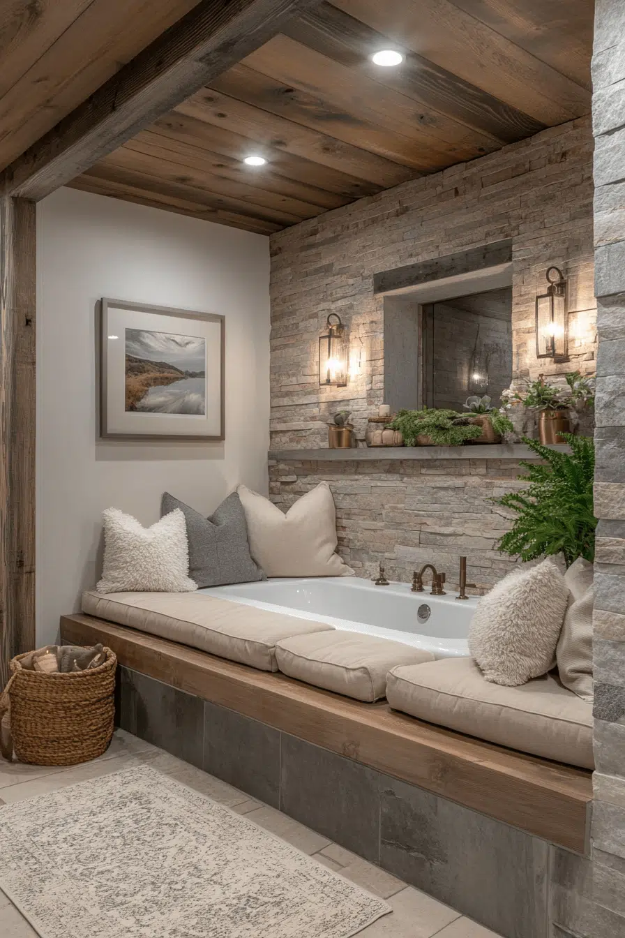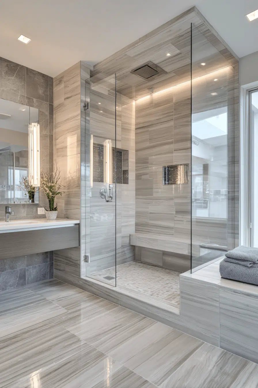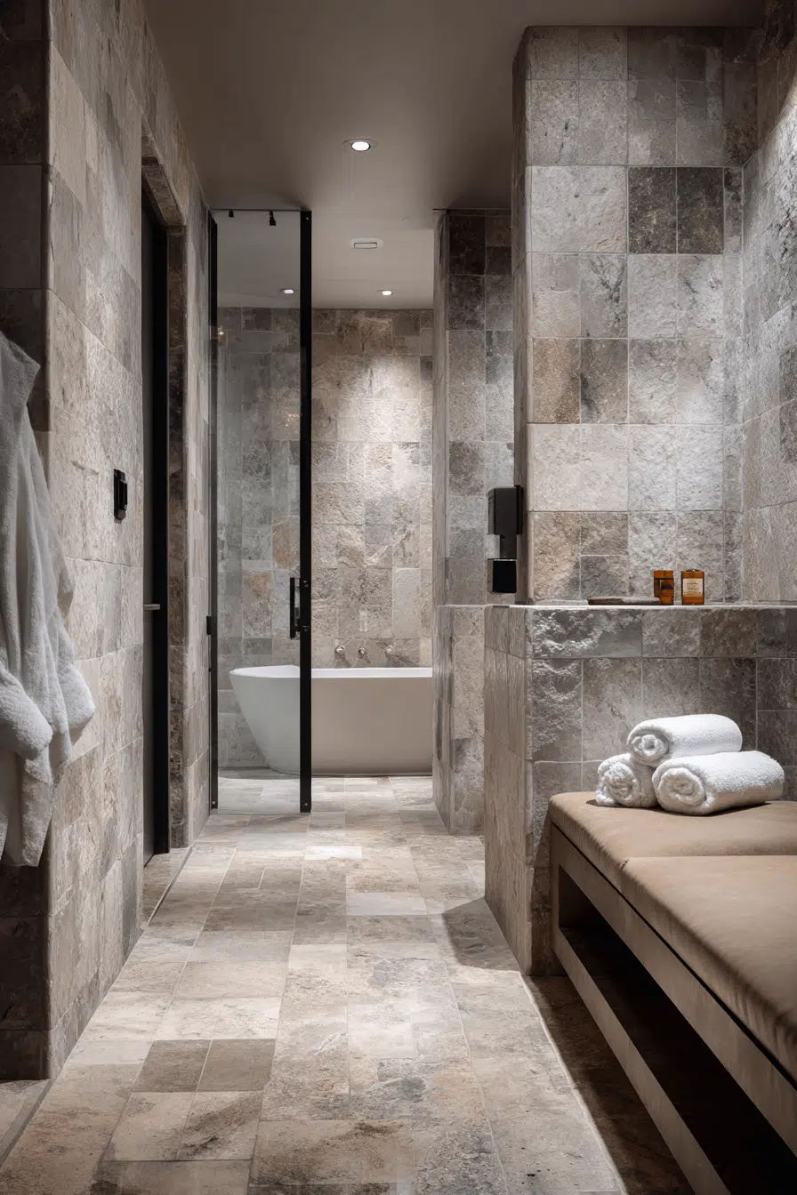 Natural stone tiles wrap this modern luxury bathroom in spa-like serenity. Built-in benches and a steam shower create an immersive wellness retreat. Soft, diffused lighting enhances the soothing environment. A neutral palette keeps the mood calm and cohesive. Relaxation becomes part of the design itself. Tap to explore more indulgent stone-inspired modern luxury bathroom upgrades!