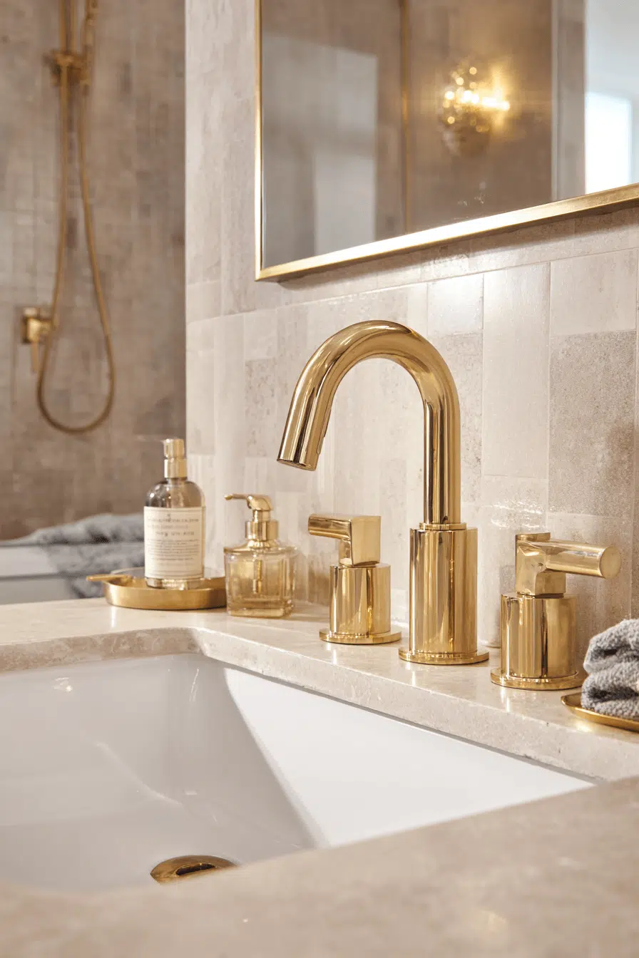 Champagne-toned metallic accents wrap this modern luxury bathroom in understated glamour. Brushed gold hardware glows beautifully against creamy stone and soft neutral cabinetry. Clean silhouettes ensure the space feels refined rather than ornate. Subtle lighting highlights the metallic warmth without overwhelming the palette. The mood is both celebratory and soothing. Tap to discover more modern luxury bathroom designs with luminous gold details!