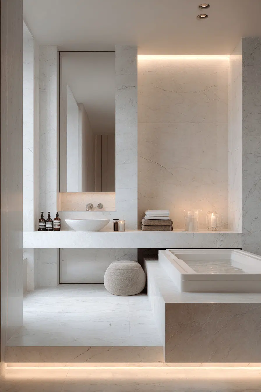 A floating vanity introduces architectural lightness into this modern luxury bathroom. Raised cabinetry creates openness and flow. Under-cabinet lighting enhances the sense of luxury. Seamless countertops maintain clean lines. The design feels airy and refined. Click to discover more floating vanity modern luxury bathroom ideas!