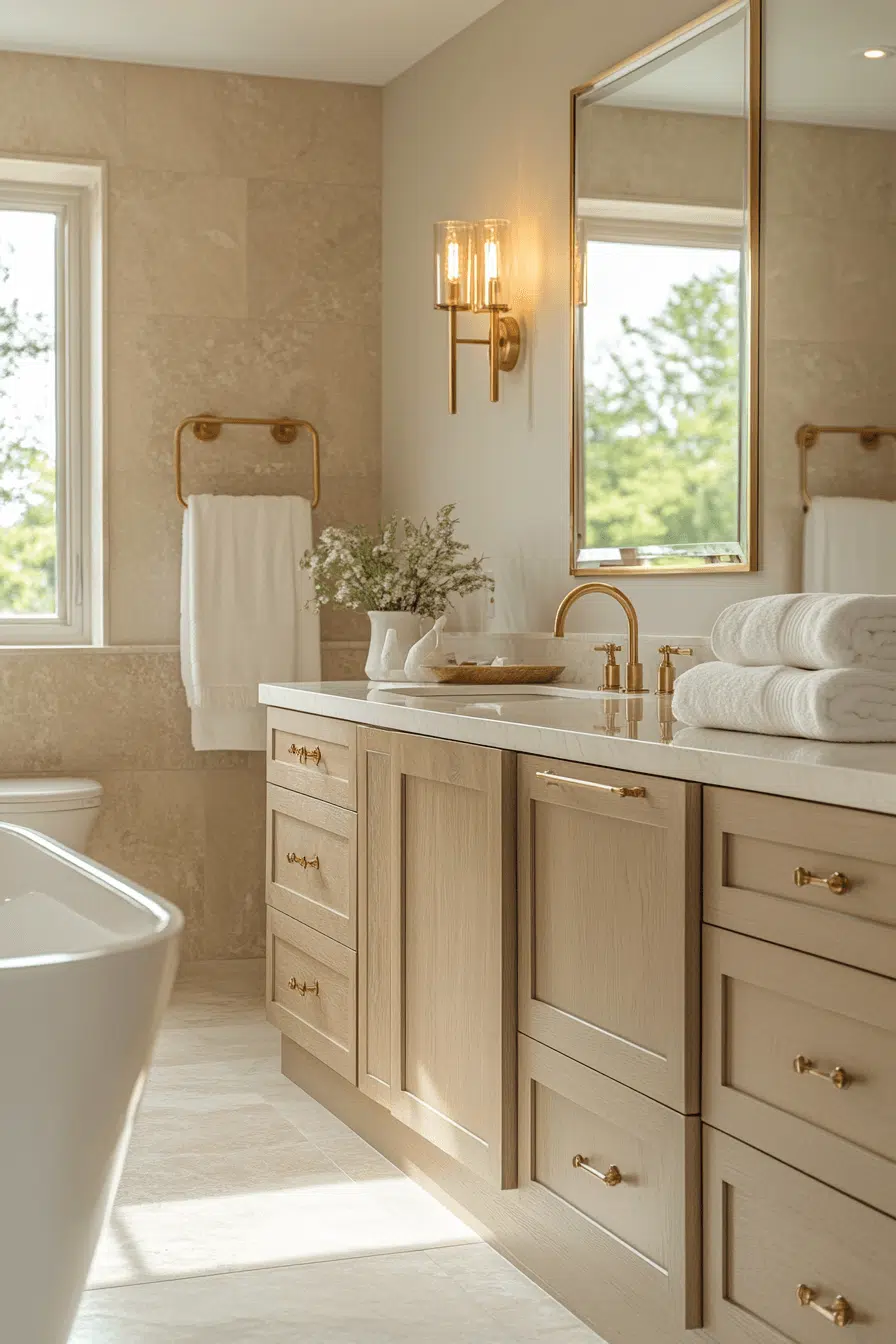 Soft beige slabs envelop this modern luxury bathroom in calm sophistication. Warm metals and natural wood accents add dimension. Clean cabinetry keeps everything streamlined. Textured linens introduce subtle interest. The atmosphere feels serene yet elevated. Click for more beige-toned modern luxury bathroom inspiration!