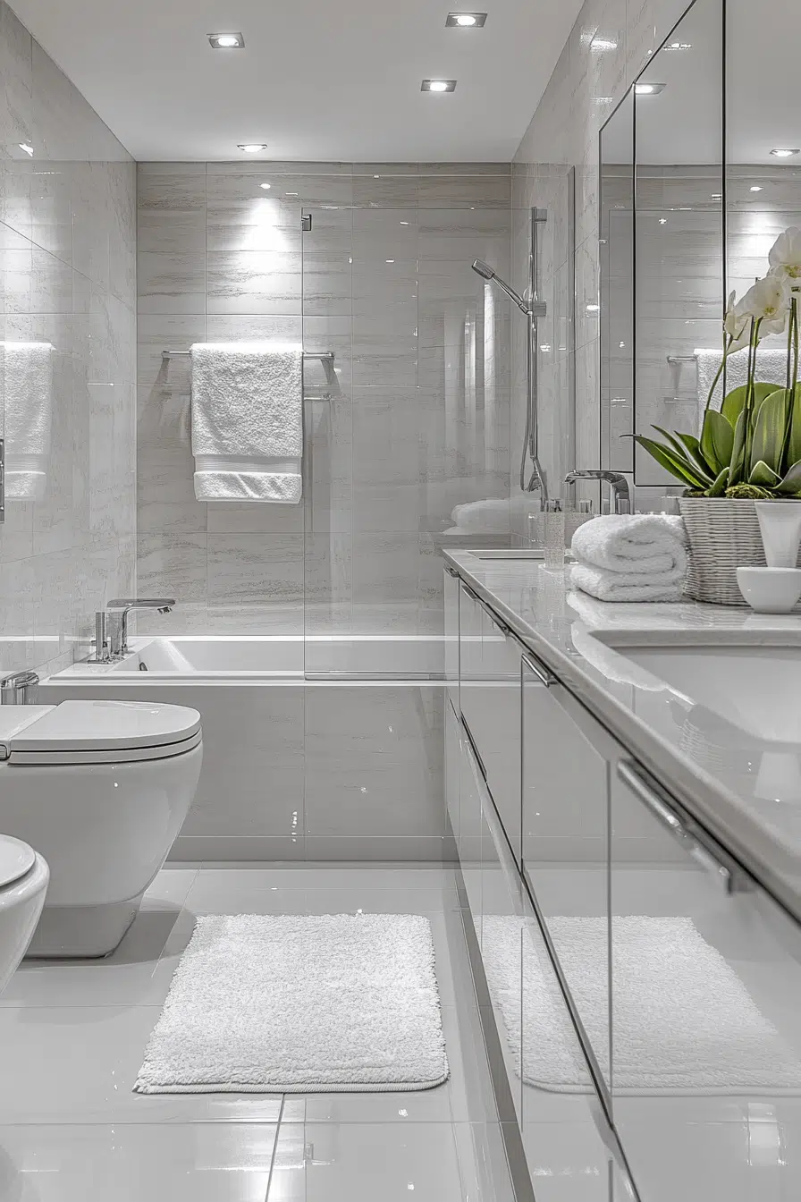 High-gloss cabinetry and tiles add luminous energy to this modern luxury bathroom. Reflective finishes amplify light beautifully. Matte elements balance the shine for sophistication. Sleek hardware maintains a contemporary feel. The space feels bright and polished. Tap to explore high-gloss modern luxury bathroom concepts!