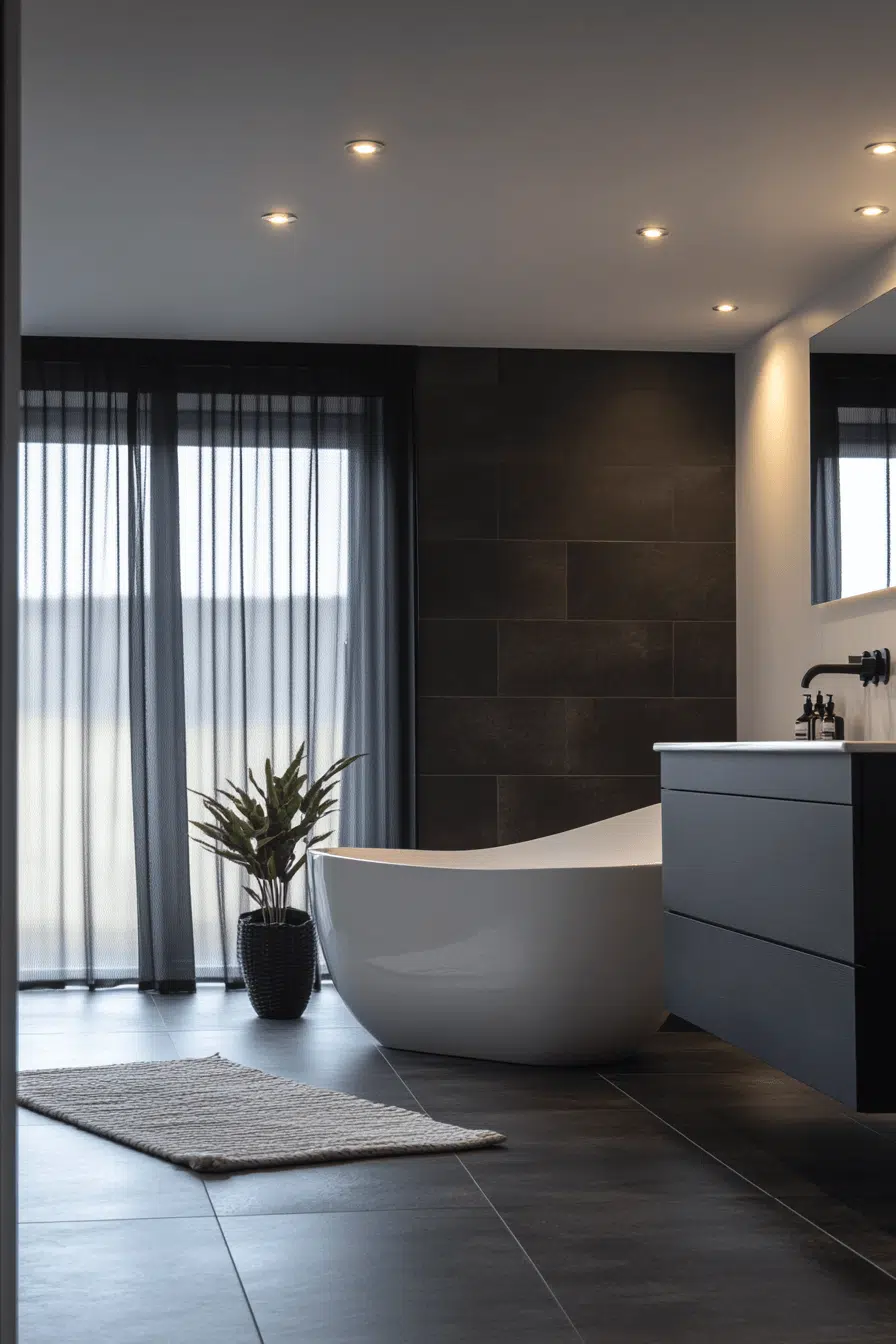 A crisp black-and-white palette gives this modern luxury bathroom bold clarity. High contrast sharpens architectural lines. Frameless mirrors enhance simplicity. Textured elements prevent flatness. The look feels timeless yet modern. Tap to explore monochrome modern luxury bathroom ideas!
