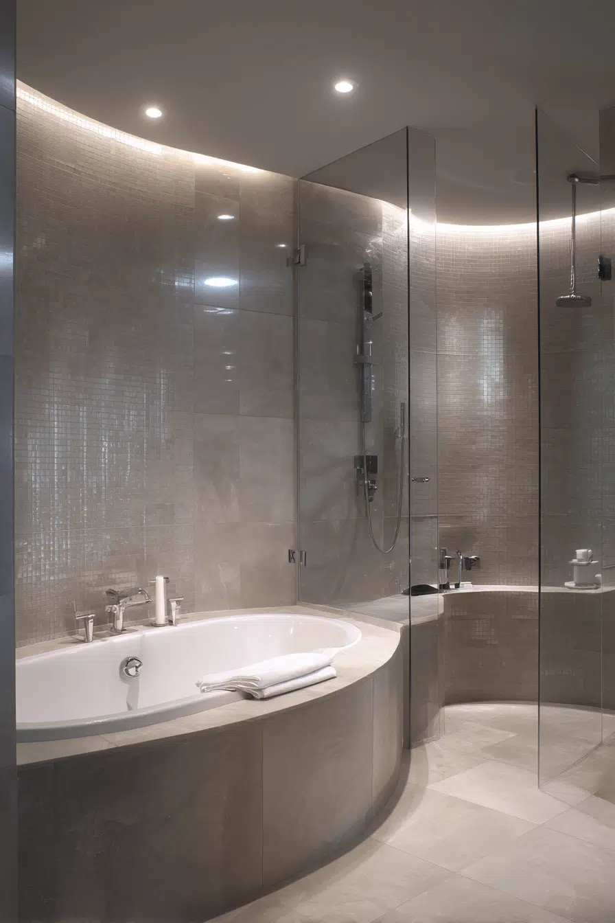 Curved tile and rounded details soften this modern luxury bathroom with subtle charm. Arched niches add architectural interest. Neutral tones maintain balance. Smooth materials preserve modern clarity. The space feels refined yet inviting. Click to discover curved modern luxury bathroom ideas!