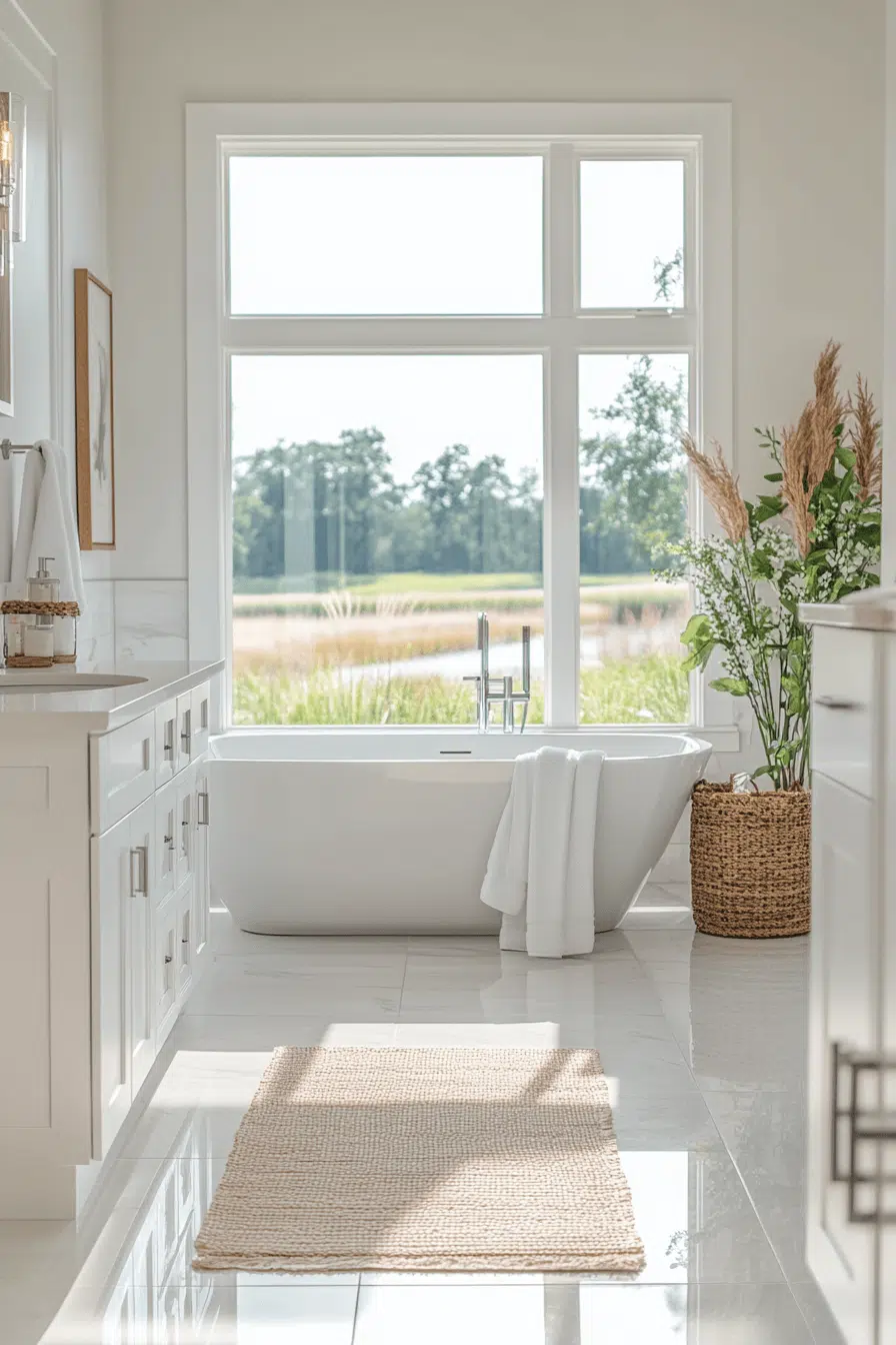 Layers of warm whites and soft ivory give this modern luxury bathroom an airy, timeless presence. Matte cabinetry and smooth stone surfaces create cohesion throughout. Minimal decor allows premium materials to shine naturally. Subtle textures in linens add warmth without distraction. Natural light enhances the calm sophistication. Tap to explore more bright and serene modern luxury bathroom ideas!