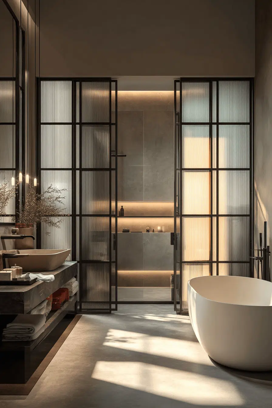 Smoked glass introduces refined drama to this modern luxury bathroom. Tinted shower panels add depth while maintaining openness. Sleek finishes prevent the look from feeling heavy. Soft lighting enhances the translucent glow. Privacy and elegance coexist seamlessly. Click to discover how smoked glass can elevate your modern luxury bathroom!