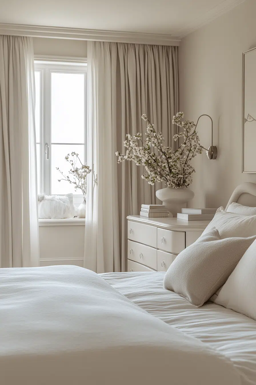 Cool-toned neutrals shape this elegantly restrained Neo Deco bedroom palette. Soft grays and ivory create calm contrast. Subtle metallic accents catch the light gently. The overall atmosphere feels airy and upscale. Quiet glamour defines the aesthetic. Tap to embrace cool, polished tranquility!