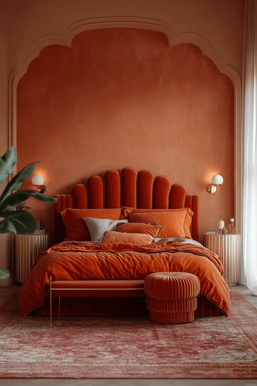 Sun-kissed hues warm this inviting Neo Deco bedroom with rust, apricot, and golden undertones. These earthy shades soften structured lines beautifully. Metallic highlights echo the glow of sunset light. The combination feels cozy while maintaining elegance. Warmth and geometry coexist in harmonious balance. Tap to wrap your space in radiant warmth!