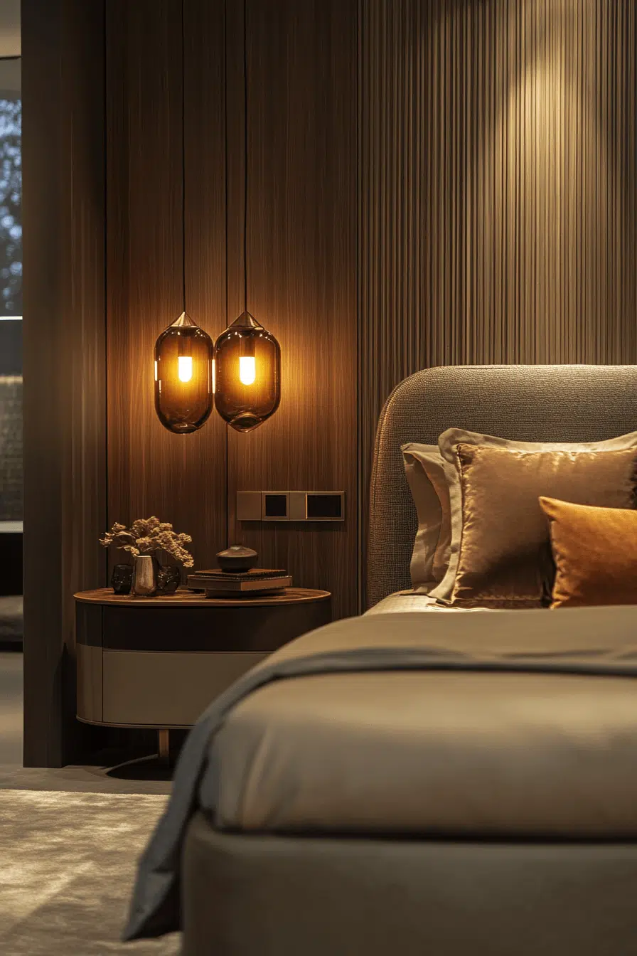 Layered illumination transforms this Neo Deco bedroom into a glowing sanctuary. Sculpted sconces and pendant fixtures provide multidimensional light. Frosted glass and metallic finishes enhance the atmosphere. Strategic placement highlights architectural details and plush textures. The mood shifts effortlessly from bright to intimate. Click to redefine your bedroom with luminous artistry!