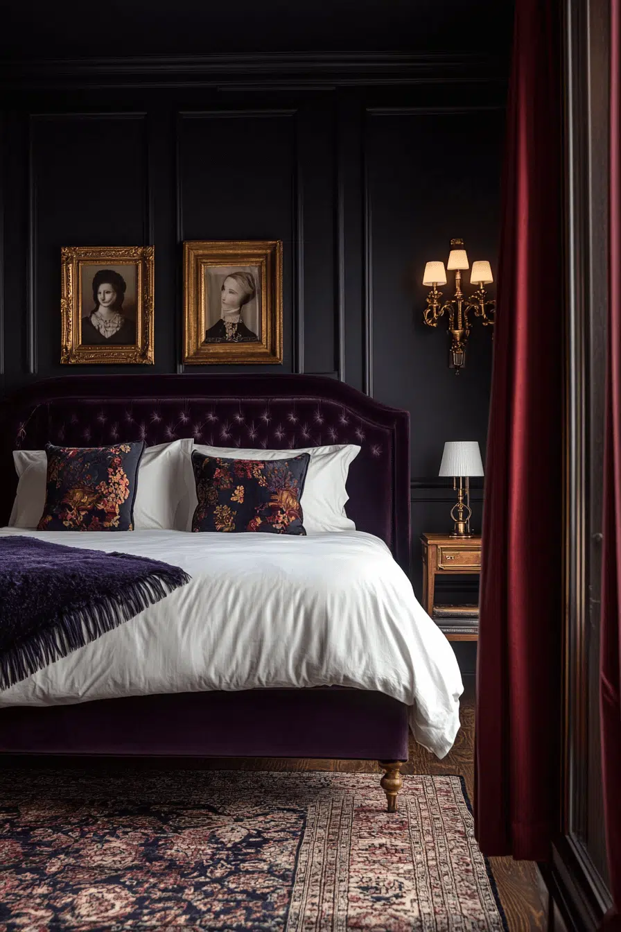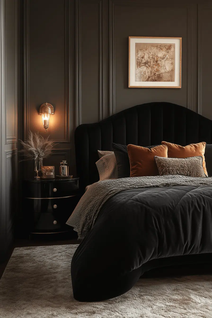 Rich midnight velvets envelop this Neo Deco bedroom in dramatic elegance and tactile comfort. Deep charcoal and espresso tones create a cocooning effect that feels intimate yet refined. Polished black furnishings enhance the moody palette while maintaining clean structure. Soft textures contrast beautifully with sleek metallic details. The atmosphere feels indulgent, layered, and irresistibly inviting. Click to step into this velvet-drenched sanctuary!