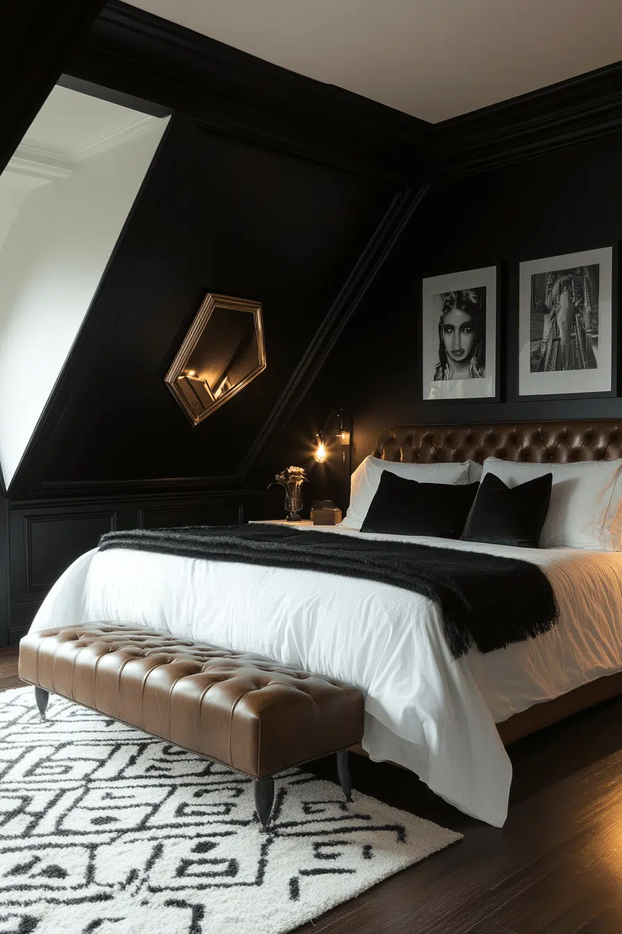 High-contrast styling defines this striking Neo Deco bedroom with graphic precision. Bold black elements against crisp white surfaces create dramatic visual tension. Glossy accents enhance the sharp geometry. Subtle metallic details introduce warmth and balance. The aesthetic feels daring yet timeless. Click to embrace bold monochrome drama!