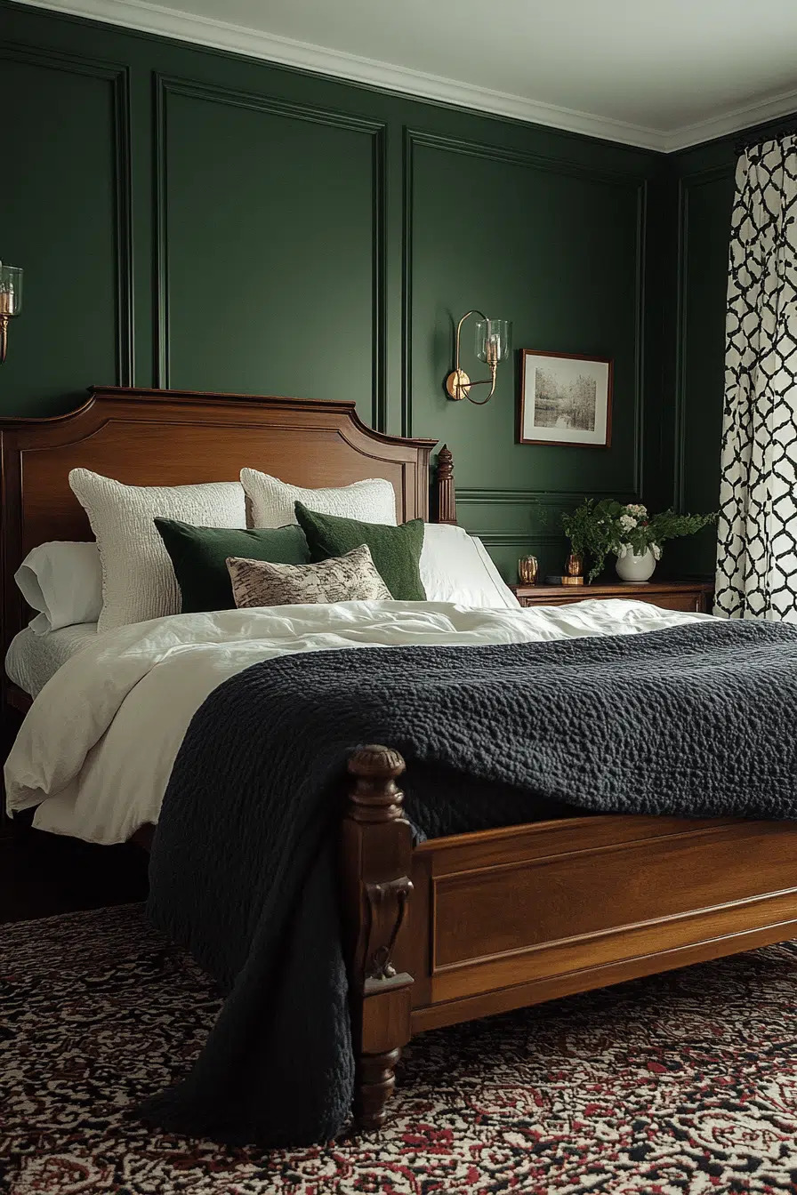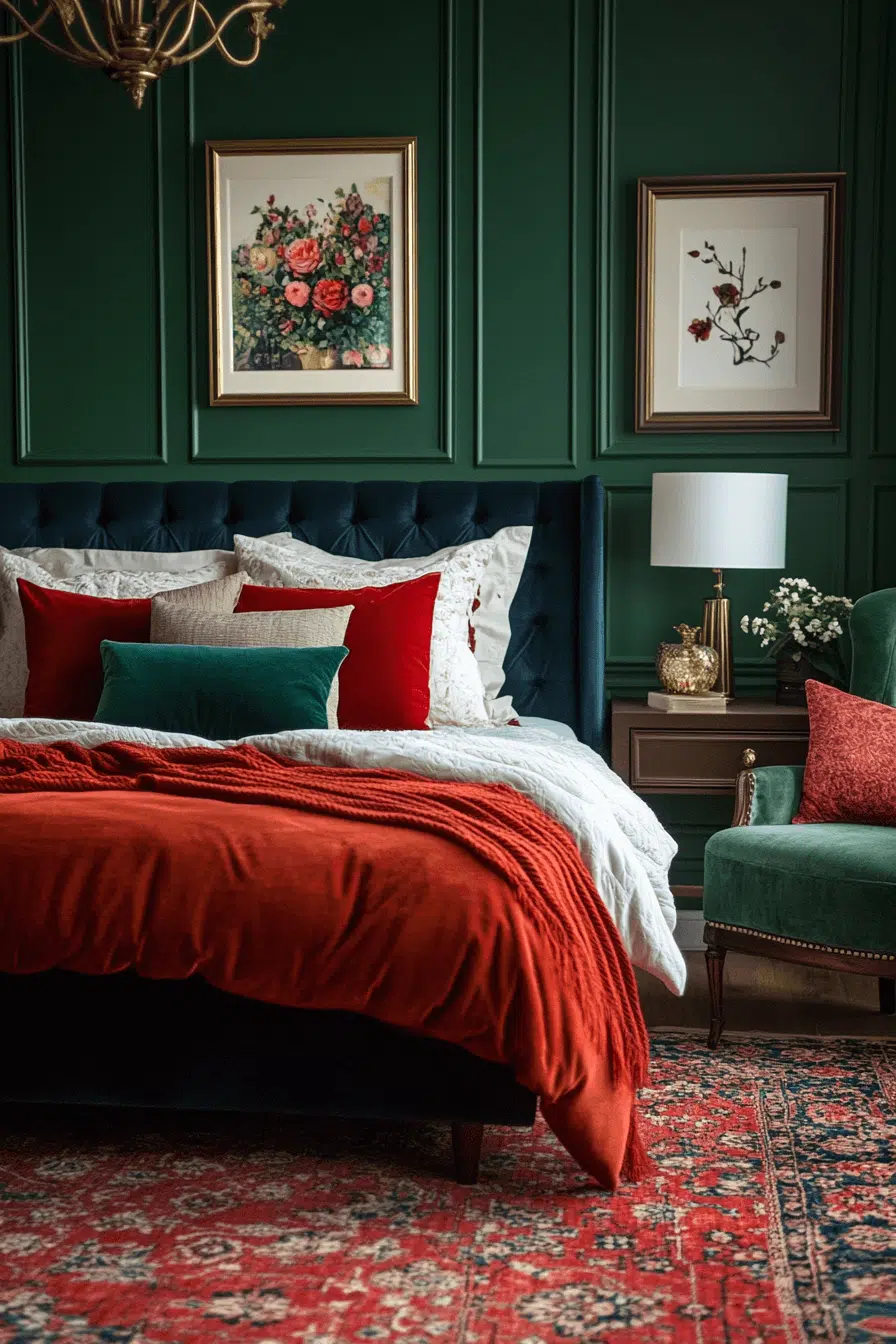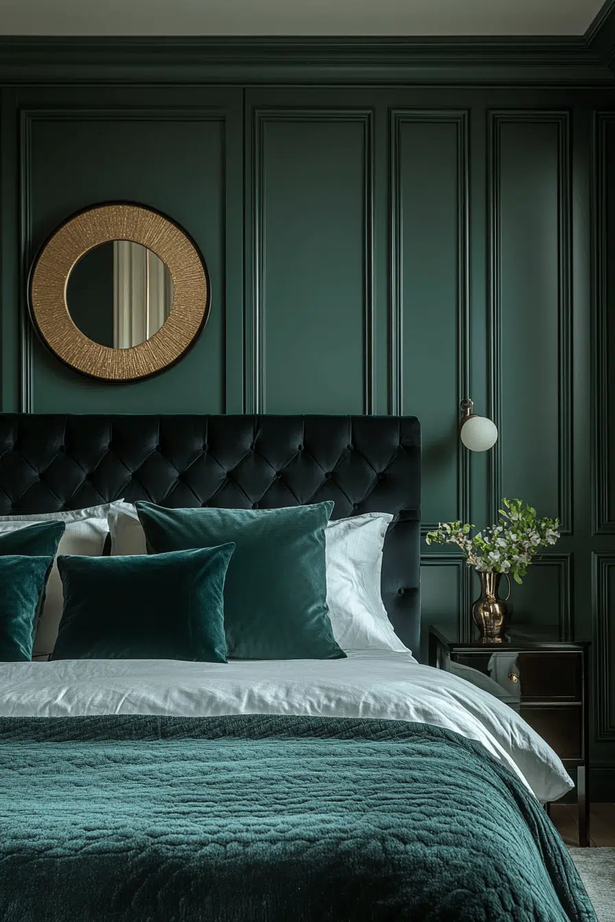 Saturated jewel tones infuse this Neo Deco bedroom with bold sophistication and depth. Emerald, sapphire, and plum hues elevate the space with regal intensity. Velvet textures and gilded accents heighten the luxurious effect. Structured layouts maintain composure amid vibrant color. The ambiance feels curated and confidently expressive. Tap to immerse yourself in rich, mood-boosting tones!