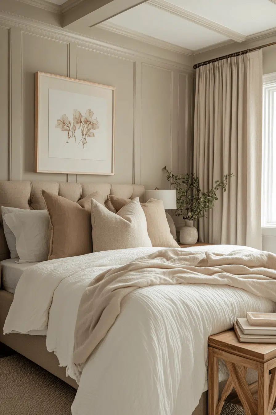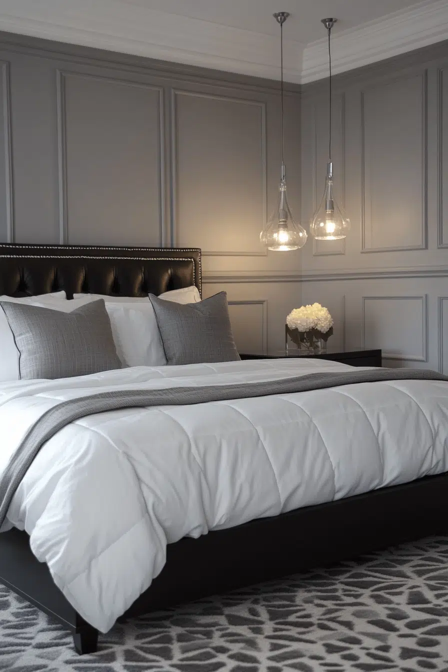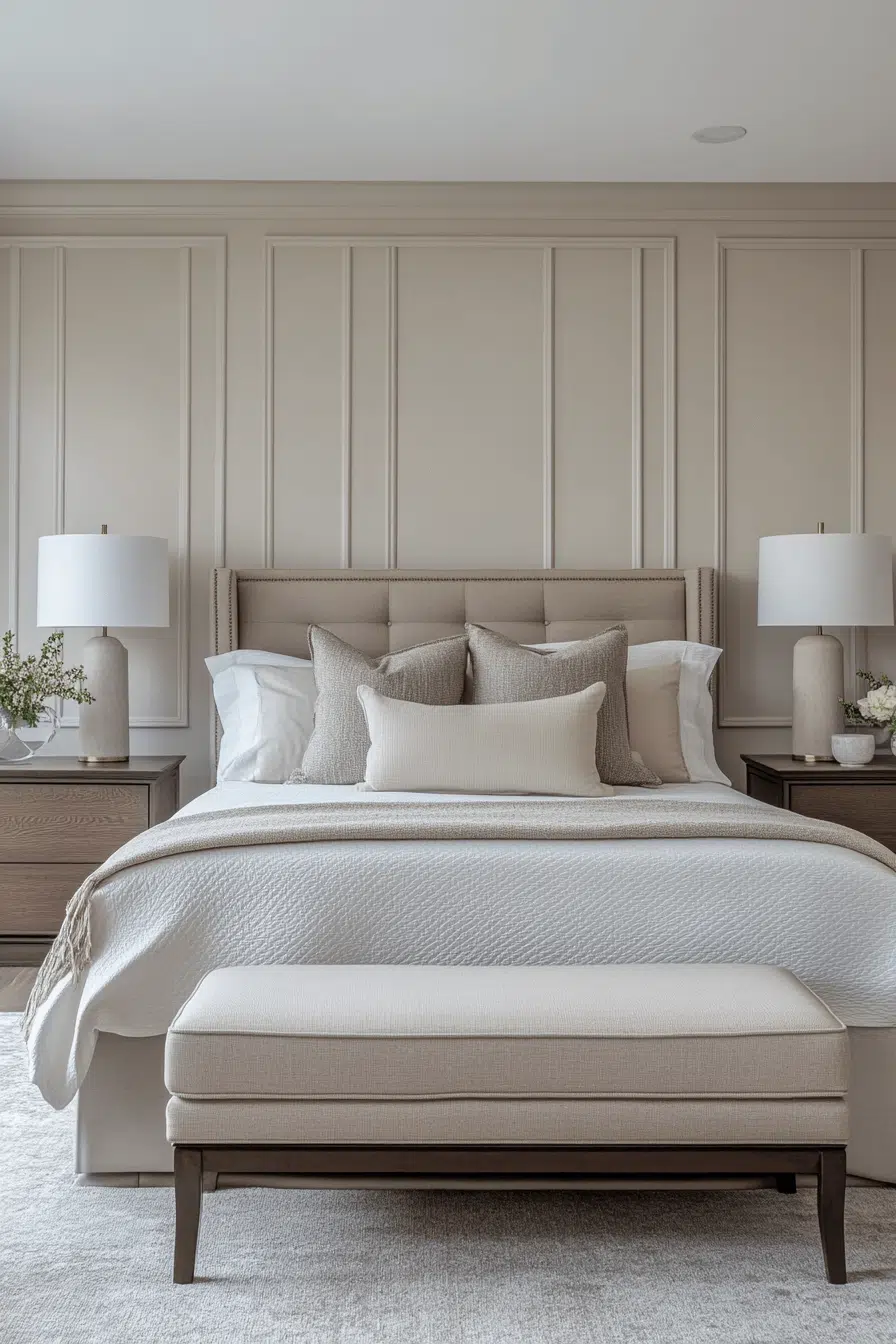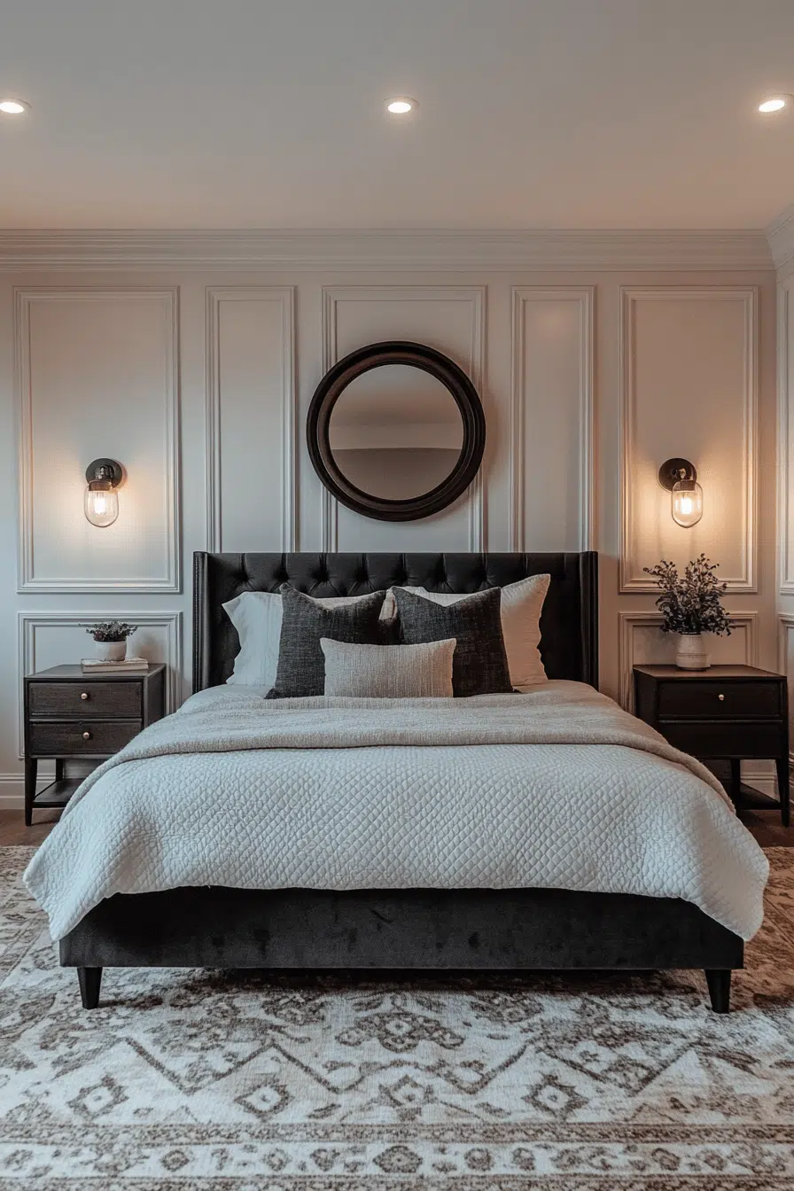 Graphic molding and defined trim elevate this Neo Deco bedroom with tailored precision. Painted borders and structured paneling add architectural interest. Matte and metallic accents frame the design thoughtfully. The effect feels curated and upscale. Every detail enhances visual clarity. Tap to refine your space with striking structure!