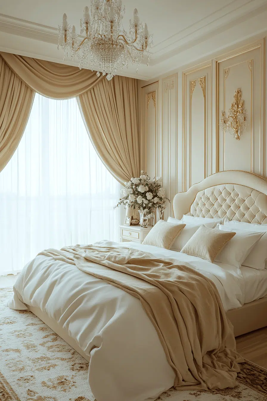 Ethereal lighting and creamy hues create a dreamy Neo Deco bedroom ambiance. Gentle gold accents shimmer softly against plush textiles. Layered fabrics enhance depth and warmth. The design feels luminous without excess. Rest and elegance intertwine beautifully. Tap to glow up your nighttime retreat!