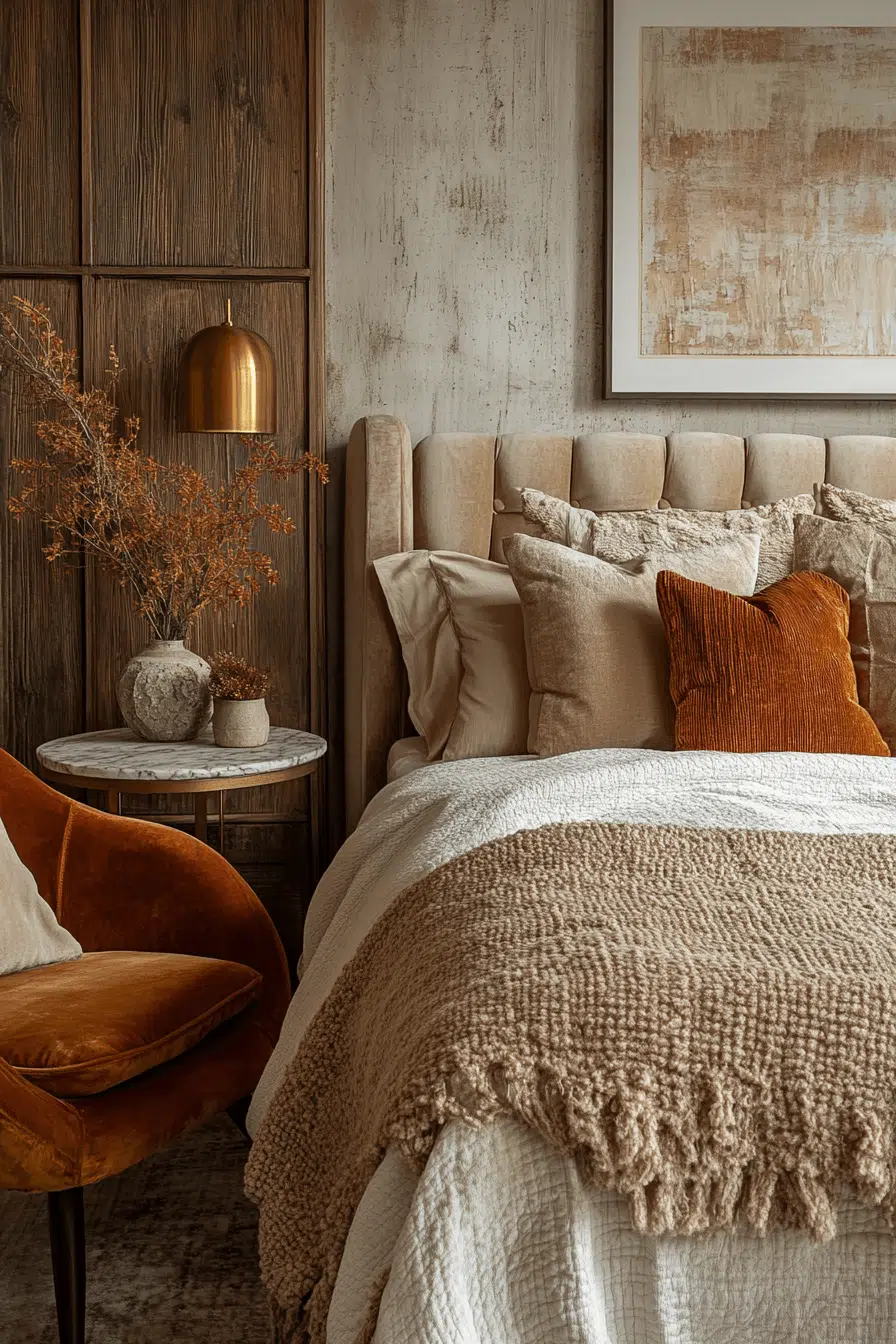Mixed material combinations redefine sophistication in this Neo Deco bedroom style. Velvet, marble, and brushed metal coexist seamlessly. Neutral palettes let textures take center stage. Each surface adds depth and richness. The look feels modern yet indulgent. Click to explore refined material layering!