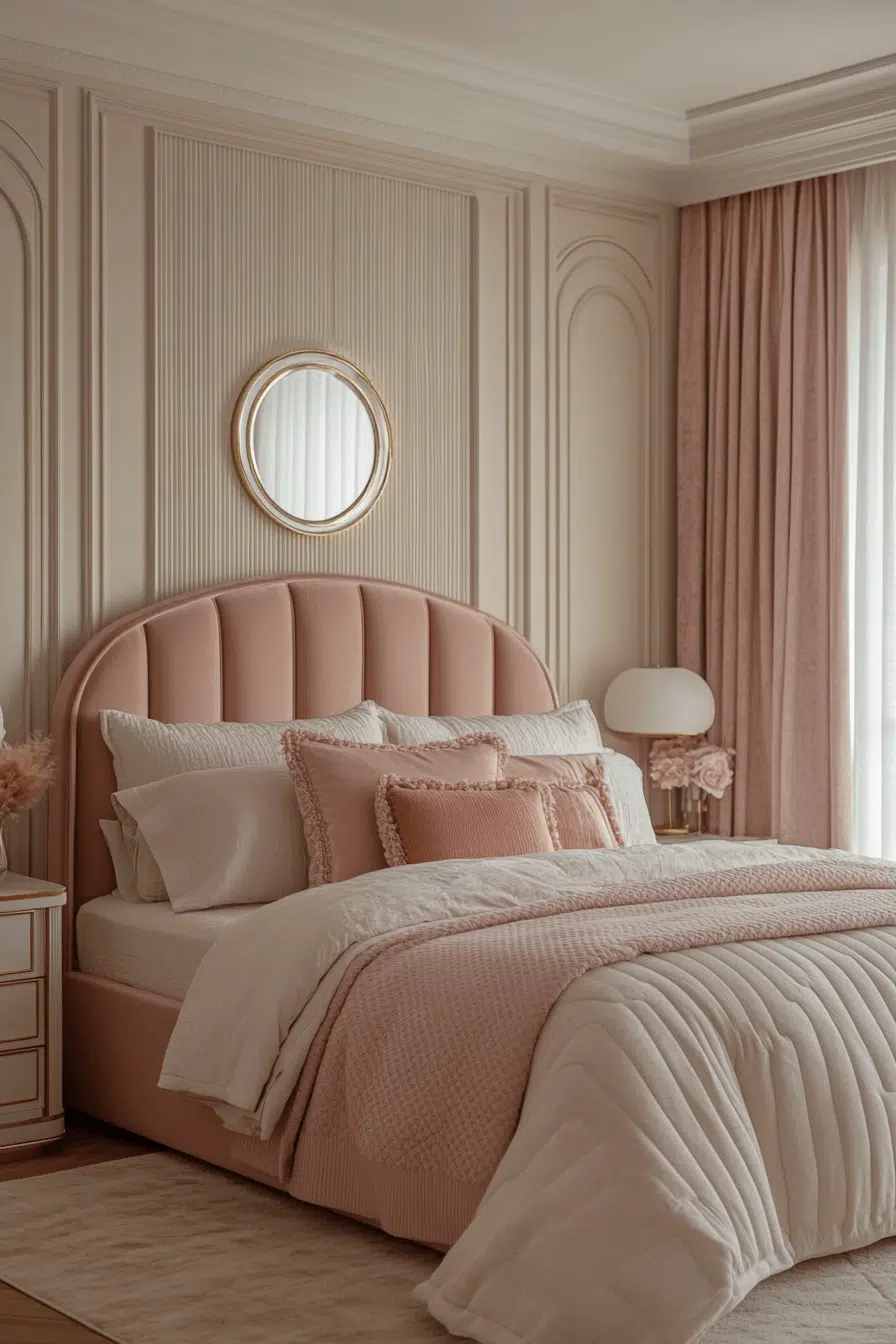 Blush-infused tones mingle effortlessly with warm brass in this luminous Neo Deco bedroom concept. The rosy undertones soften sharp lines while metallic accents introduce subtle shine. Curved mirrors and sculpted lighting fixtures add graceful dimension. The pairing feels romantic yet confidently modern. It’s a refreshing evolution of Deco glamour with contemporary charm. Tap to refresh your bedroom with radiant warmth!