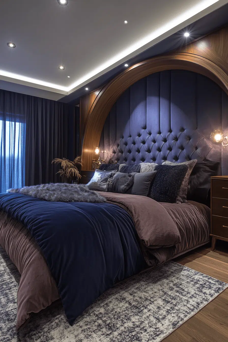 Midnight-inspired tones envelop this Neo Deco bedroom in dramatic allure. Navy, charcoal, and plum hues create a cocoon-like retreat. Metallic lighting adds sparkle against the deep backdrop. Plush textiles enhance the intimate ambiance. The design feels cinematic and indulgent. Tap to create your own night-inspired haven!