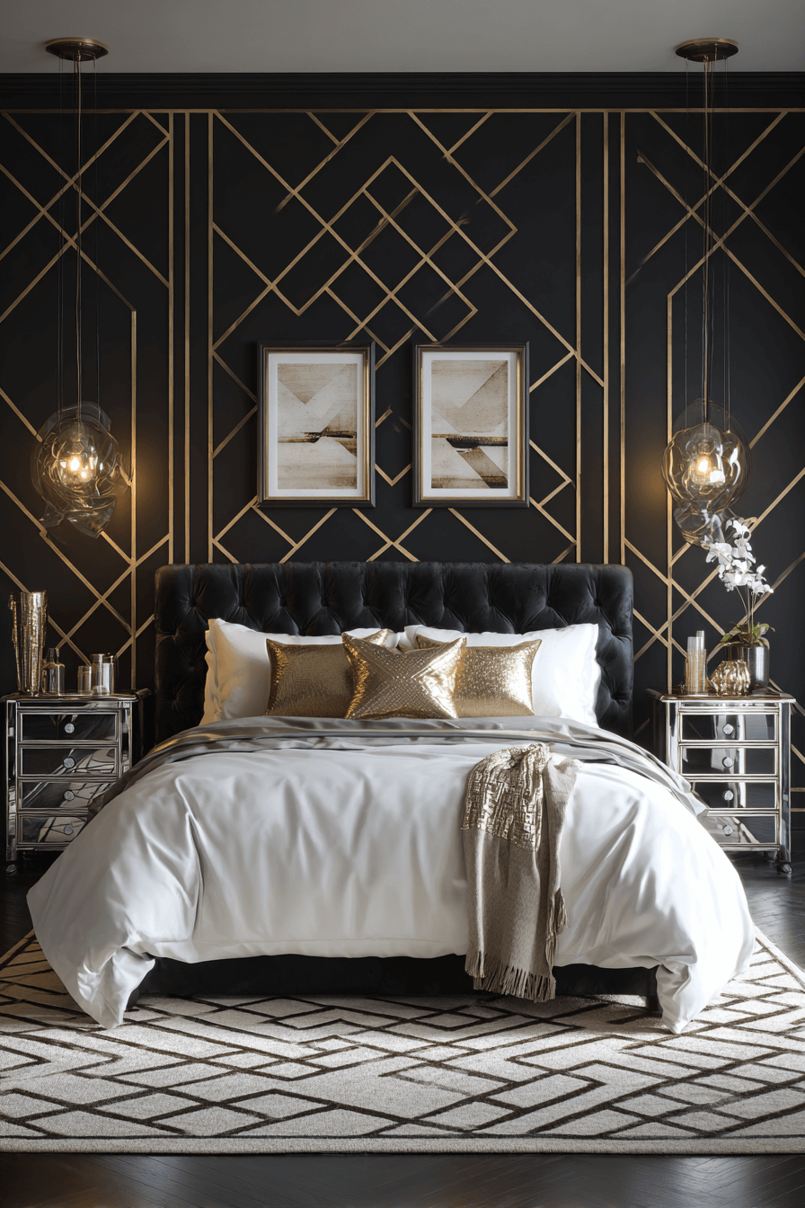 Graphic molding and defined trim elevate this Neo Deco bedroom with tailored precision. Painted borders and structured paneling add architectural interest. Matte and metallic accents frame the design thoughtfully. The effect feels curated and upscale. Every detail enhances visual clarity. Tap to refine your space with striking structure!