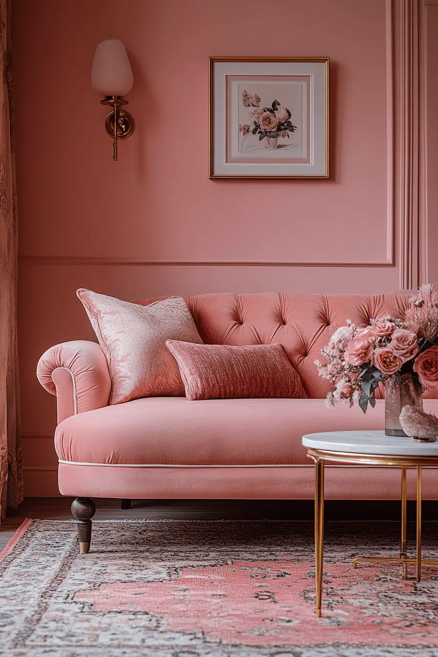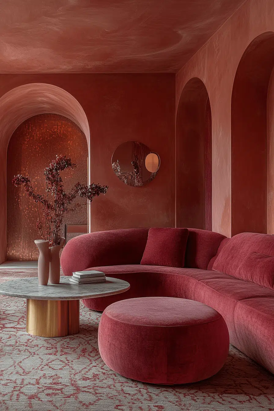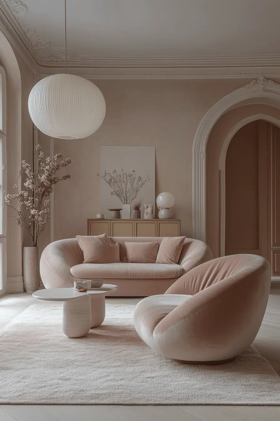 Soft rose tones combined with radiant gold details bring warmth to this Neo Deco living room. Velvet sofas and curved furnishings enhance the romantic palette. Subtle arches reinforce Deco styling. The result feels balanced and luminous. It’s sweet yet sophisticated. Indulge in this blush-infused elegance!