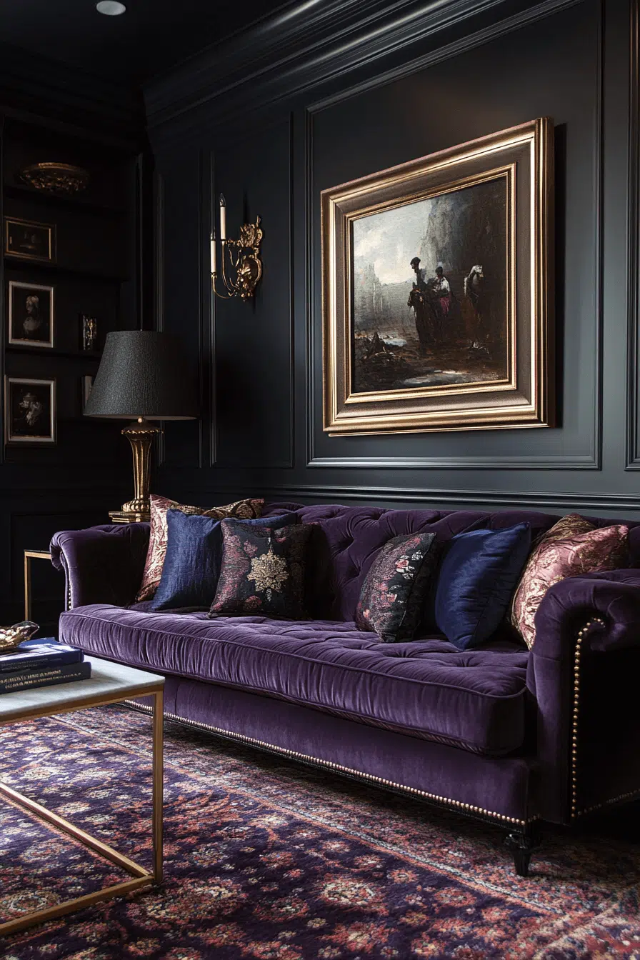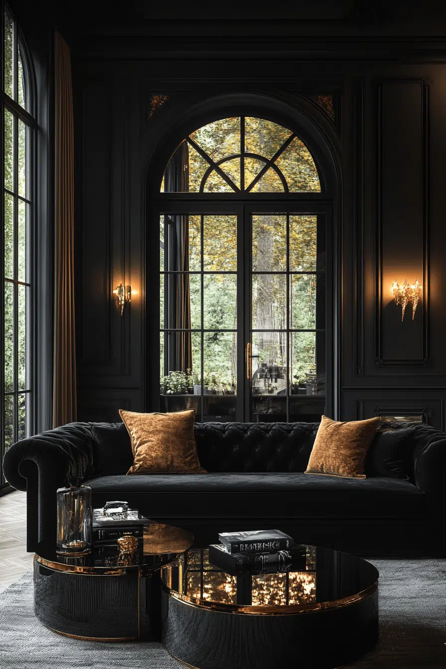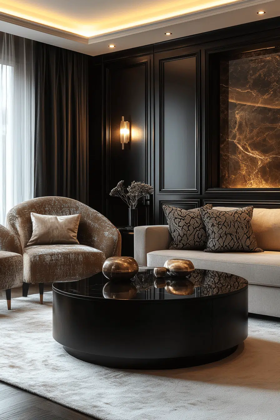 Deep charcoal walls and midnight furnishings establish a moody Neo Deco living room backdrop. Glossy finishes and golden lighting fixtures illuminate the darker tones. Velvet textures provide warmth and tactile richness. Sculptural décor enhances the dramatic effect. The atmosphere feels intimate and polished. Immerse yourself in this refined noir setting!